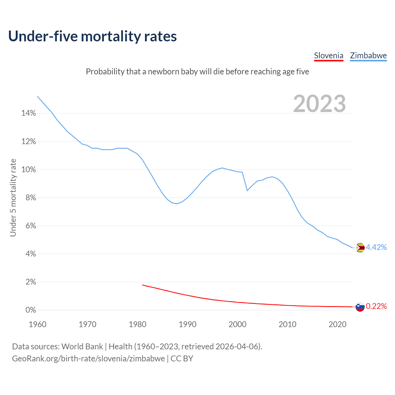 The chance that a newborn baby will die before reaching age five is 0.22% in Slovenia and 4.42% in Zimbabwe. Above is a chart with historical data on under-five mortality rates.