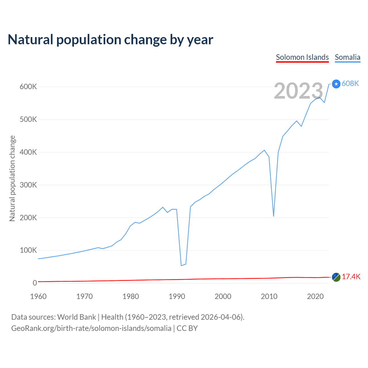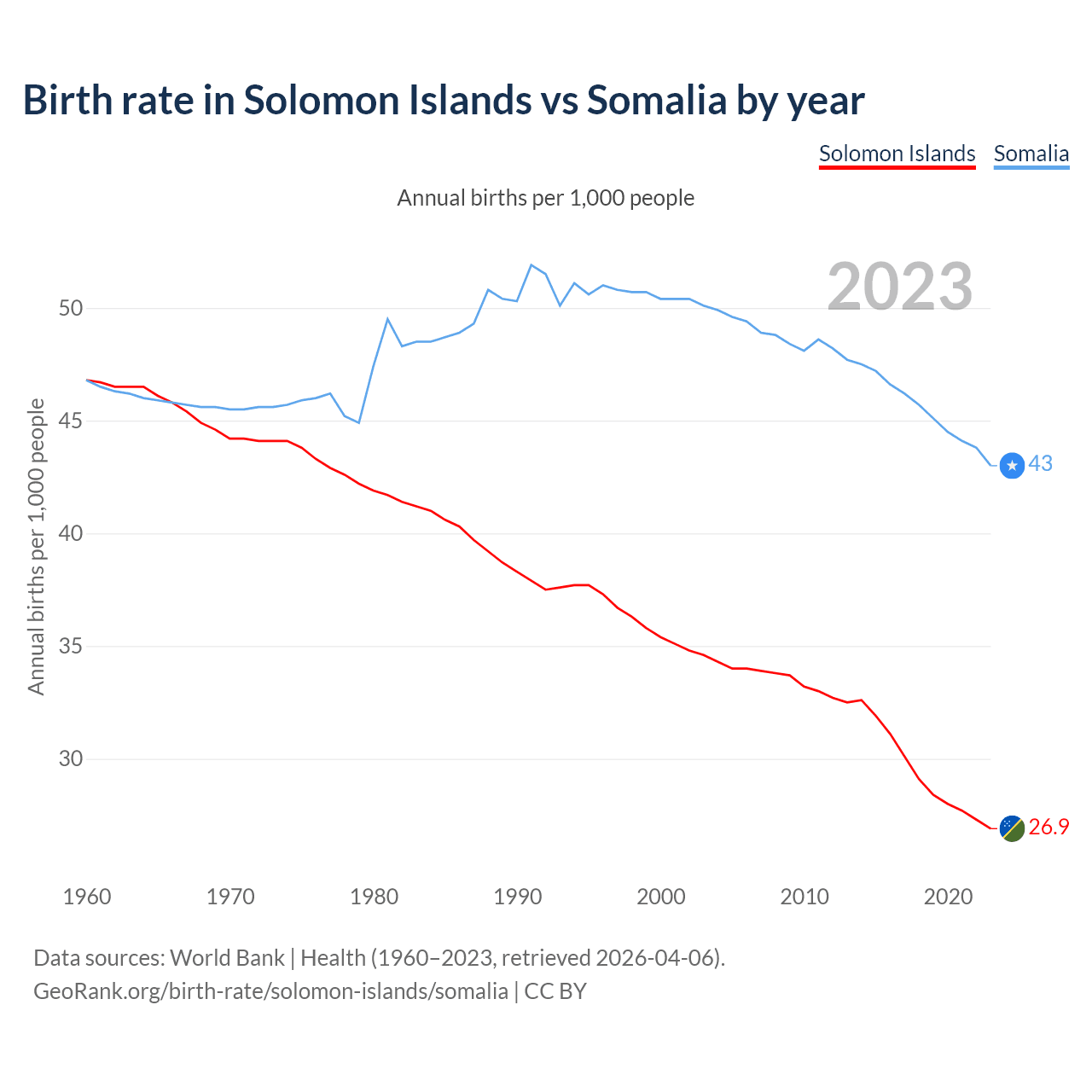 The Solomon Islands has an annual birth rate of 26.9 births per 1,000 people, compared to 43 for Somalia. The average number of children a woman is expected to have during her lifetime — the fertility rate, is 3.56 in the Solomon Islands and 6.13 in Somalia — 72.4% difference.