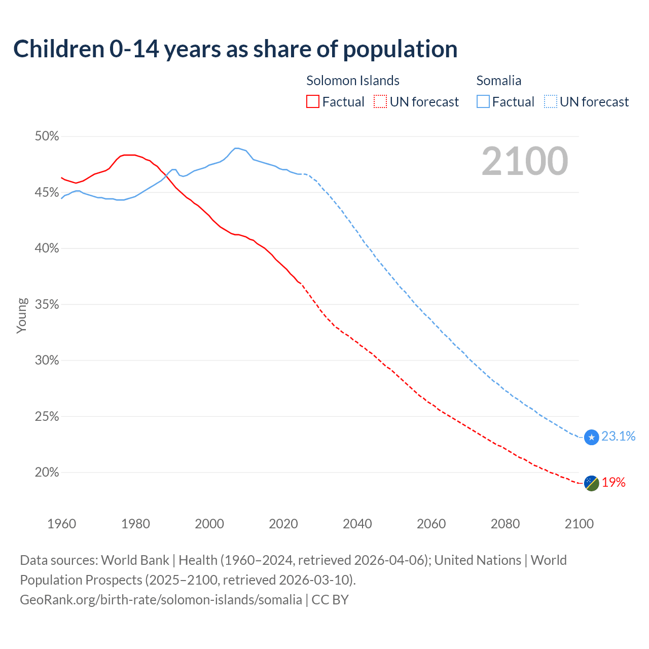 According to the latest available data on birth rates, the fertility rate in the Solomon Islands was 3.56 children per woman in 2023, compared to 6.13 in Somalia in 2023. The replacement level is considered to be 2.1 children per woman.
