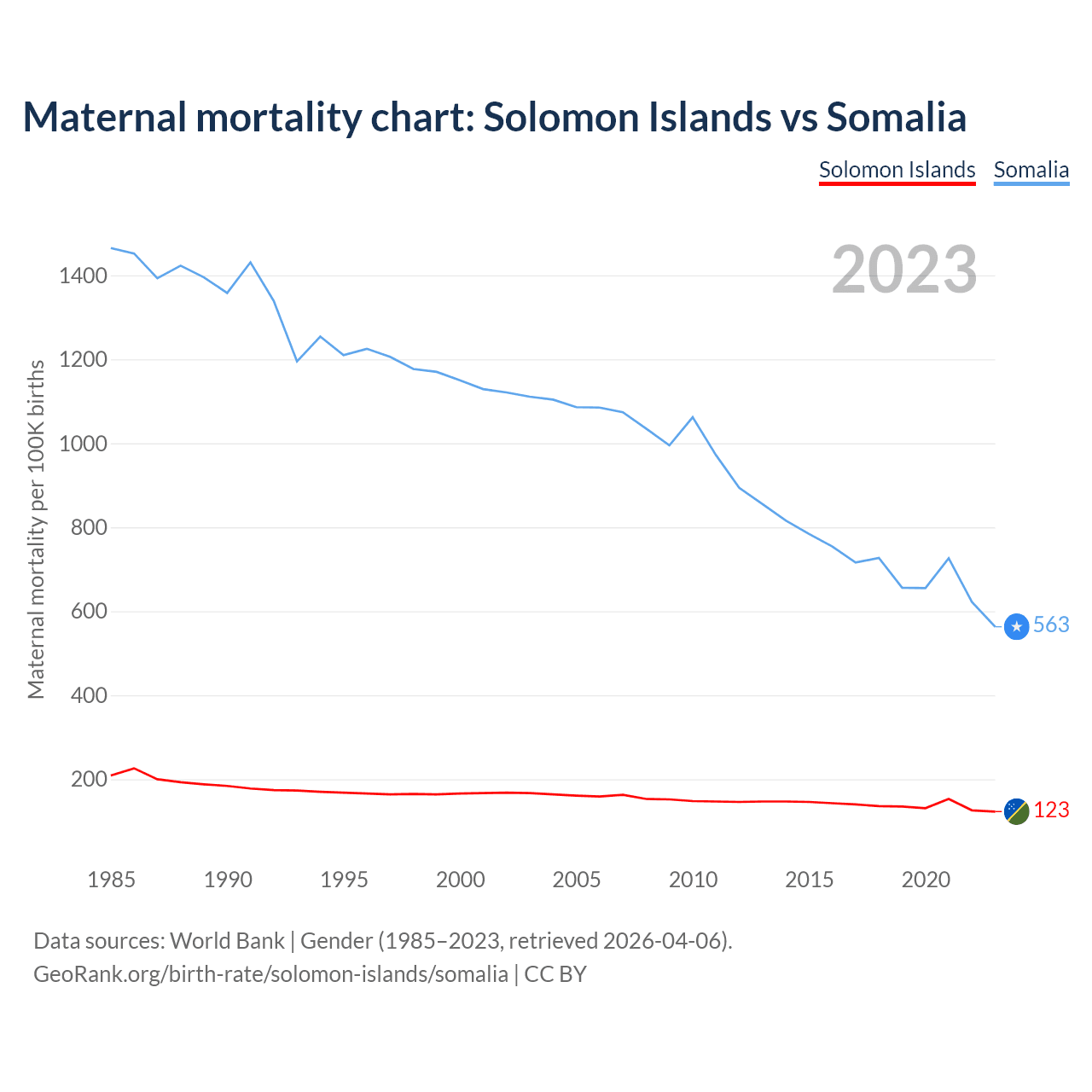 The maternal mortality rate, which is the probability of dying during childbirth or within 42 days of pregnancy termination, is 123 deaths per 100,000 live births in the Solomon Islands, compared to 563 deaths in Somalia.