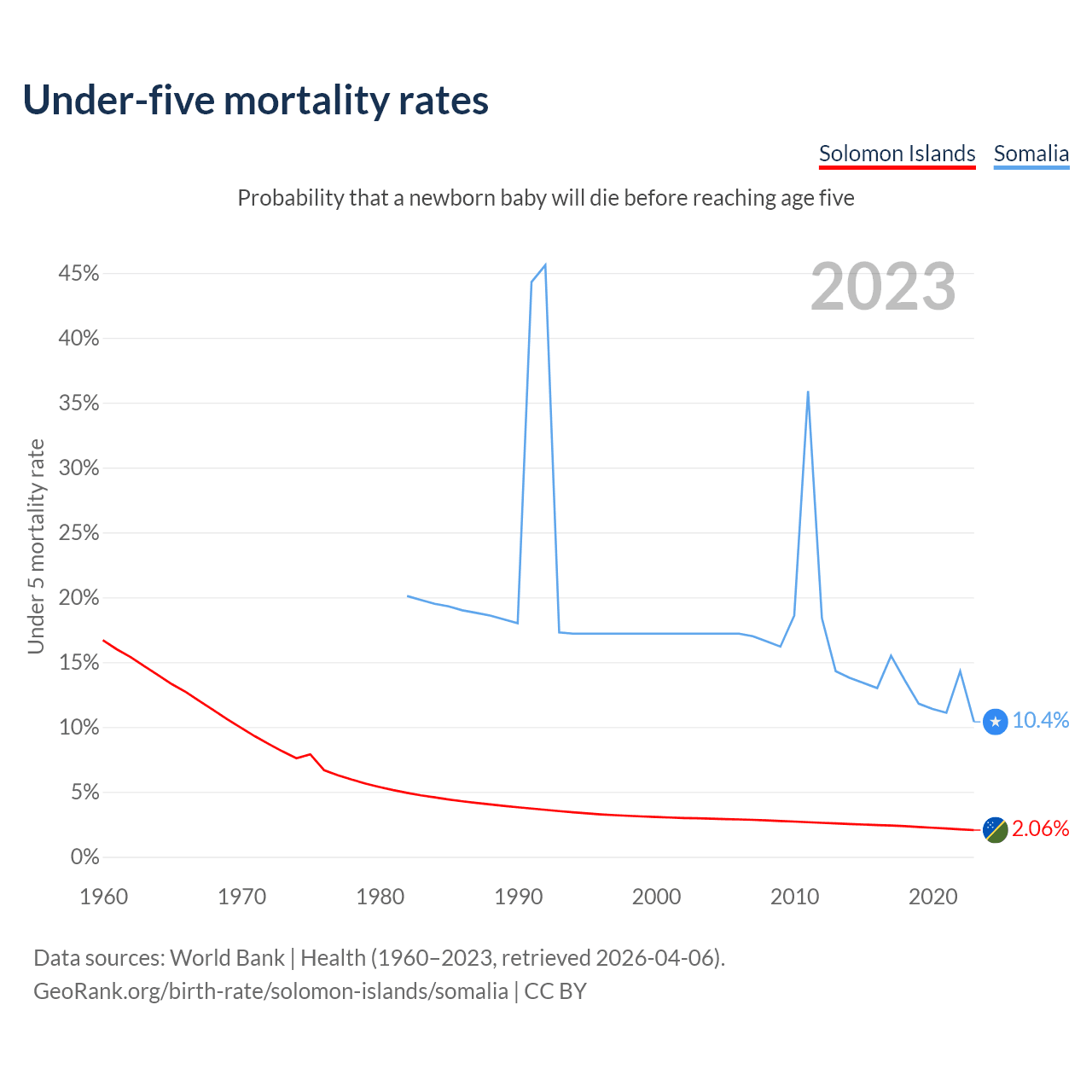 The chance that a newborn baby will die before reaching age five is 2.06% in the Solomon Islands and 10.4% in Somalia. Above is a chart with historical data on under-five mortality rates.