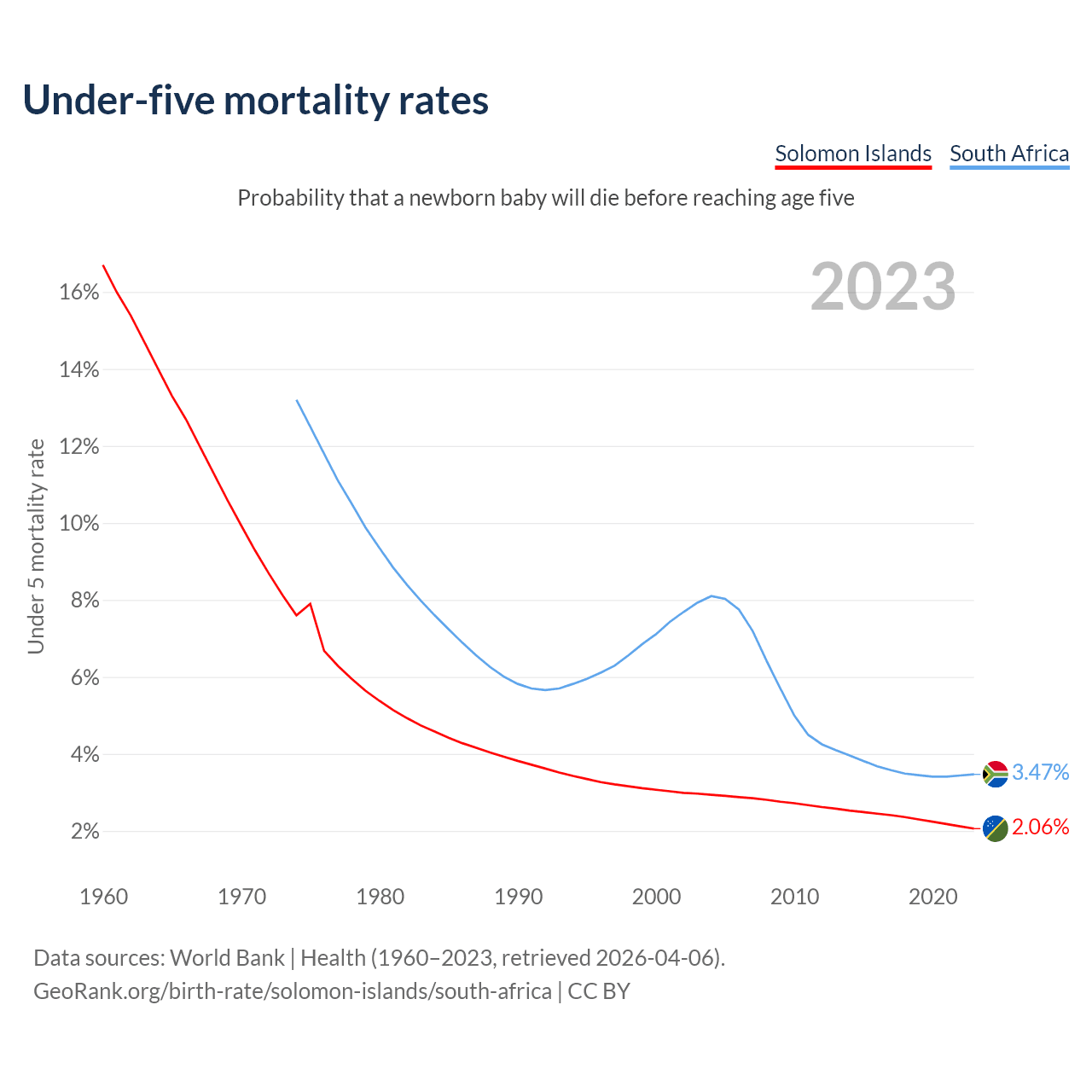 The chance that a newborn baby will die before reaching age five is 2.06% in the Solomon Islands and 3.47% in South Africa. Above is a chart with historical data on under-five mortality rates.