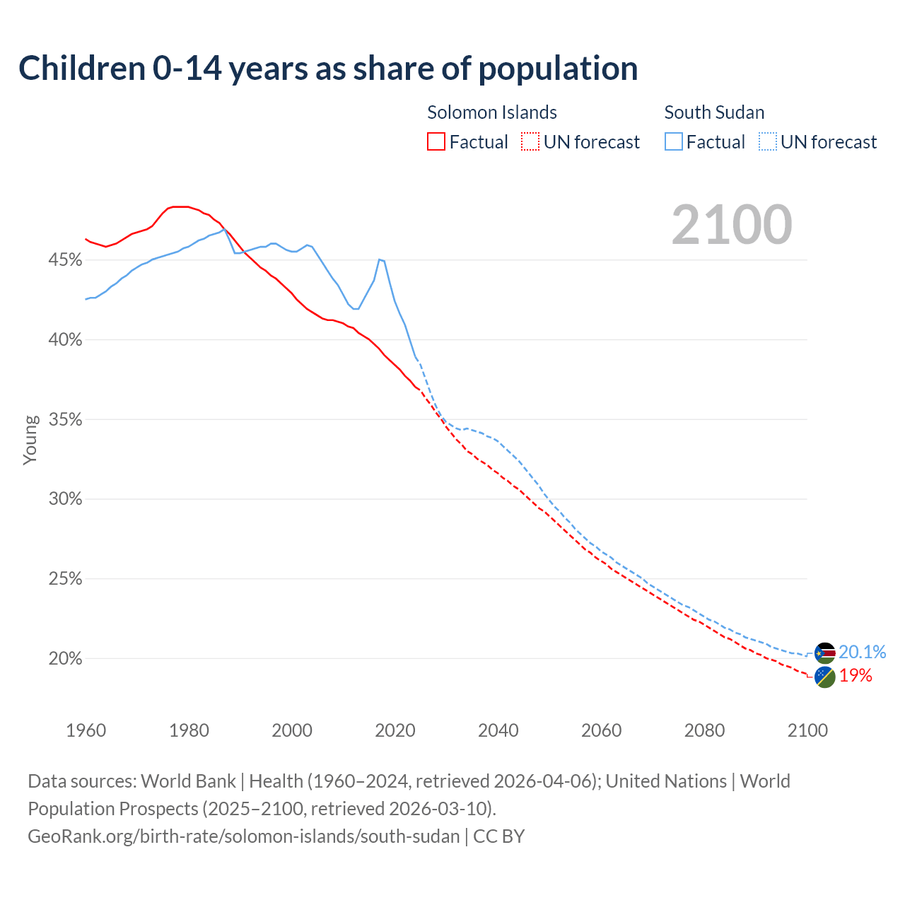 According to the latest available data on birth rates, the fertility rate in the Solomon Islands was 3.56 children per woman in 2023, compared to 3.86 in South Sudan in 2023. The replacement level is considered to be 2.1 children per woman.