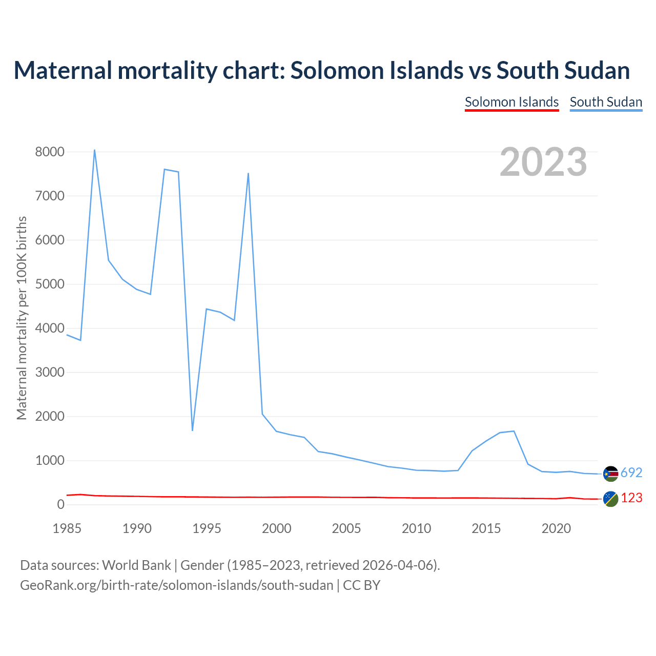 The maternal mortality rate, which is the probability of dying during childbirth or within 42 days of pregnancy termination, is 123 deaths per 100,000 live births in the Solomon Islands, compared to 692 deaths in South Sudan.