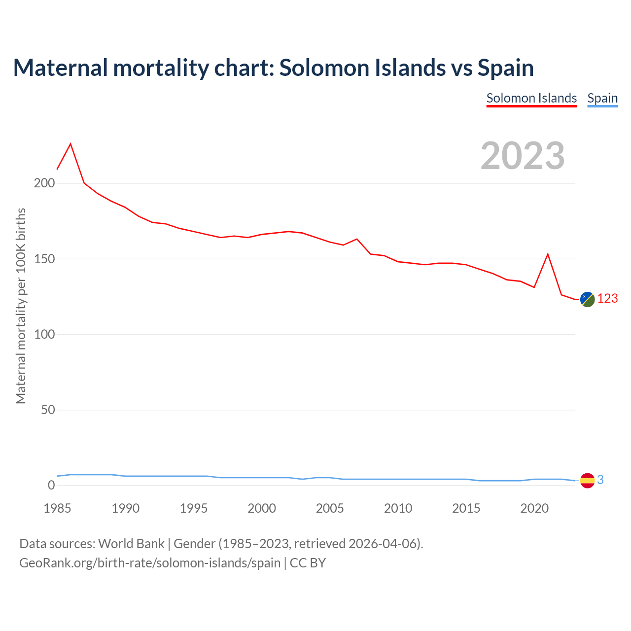 The maternal mortality rate, which is the probability of dying during childbirth or within 42 days of pregnancy termination, is 123 deaths per 100,000 live births in the Solomon Islands, compared to 3 deaths in Spain.