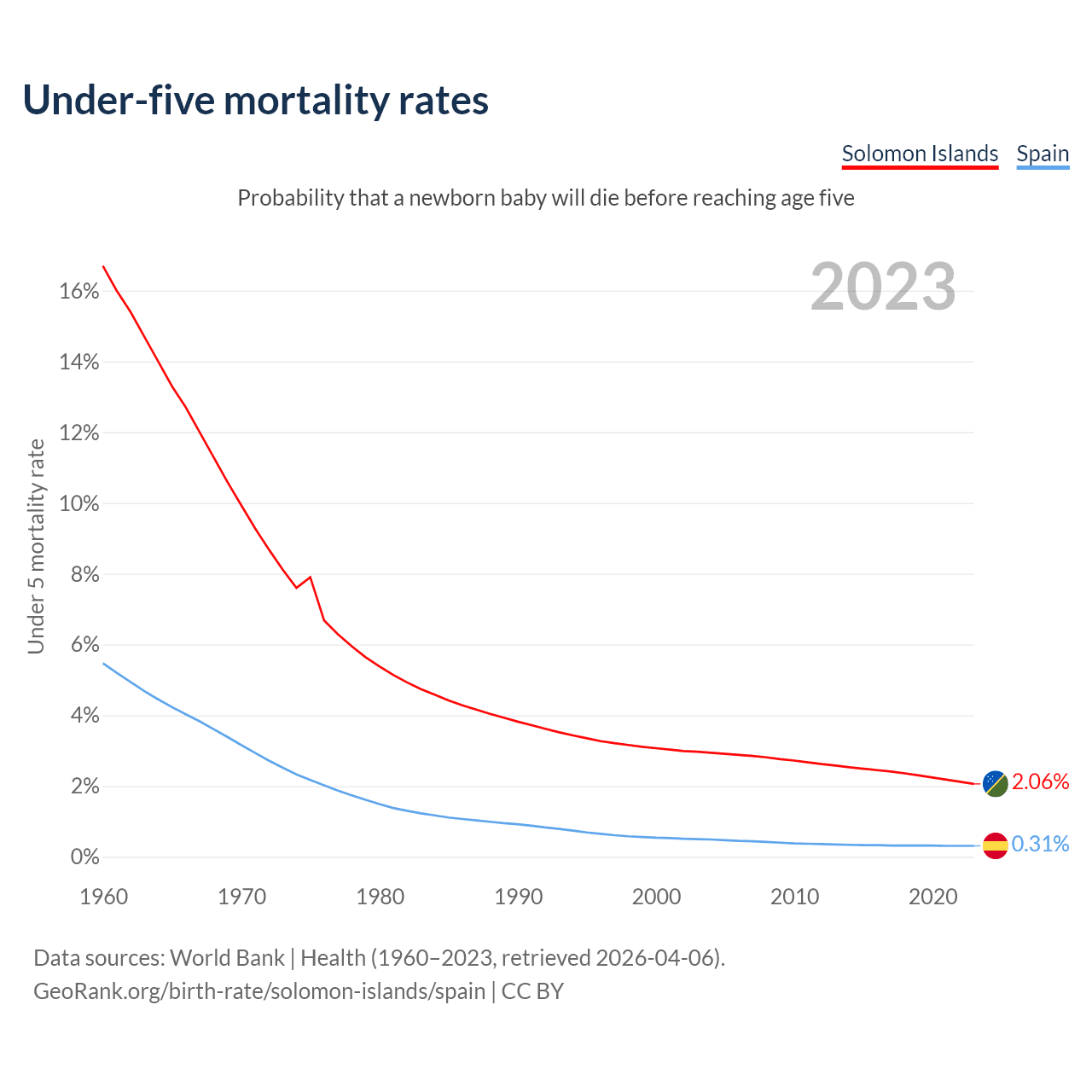 The chance that a newborn baby will die before reaching age five is 2.06% in the Solomon Islands and 0.31% in Spain. Above is a chart with historical data on under-five mortality rates.