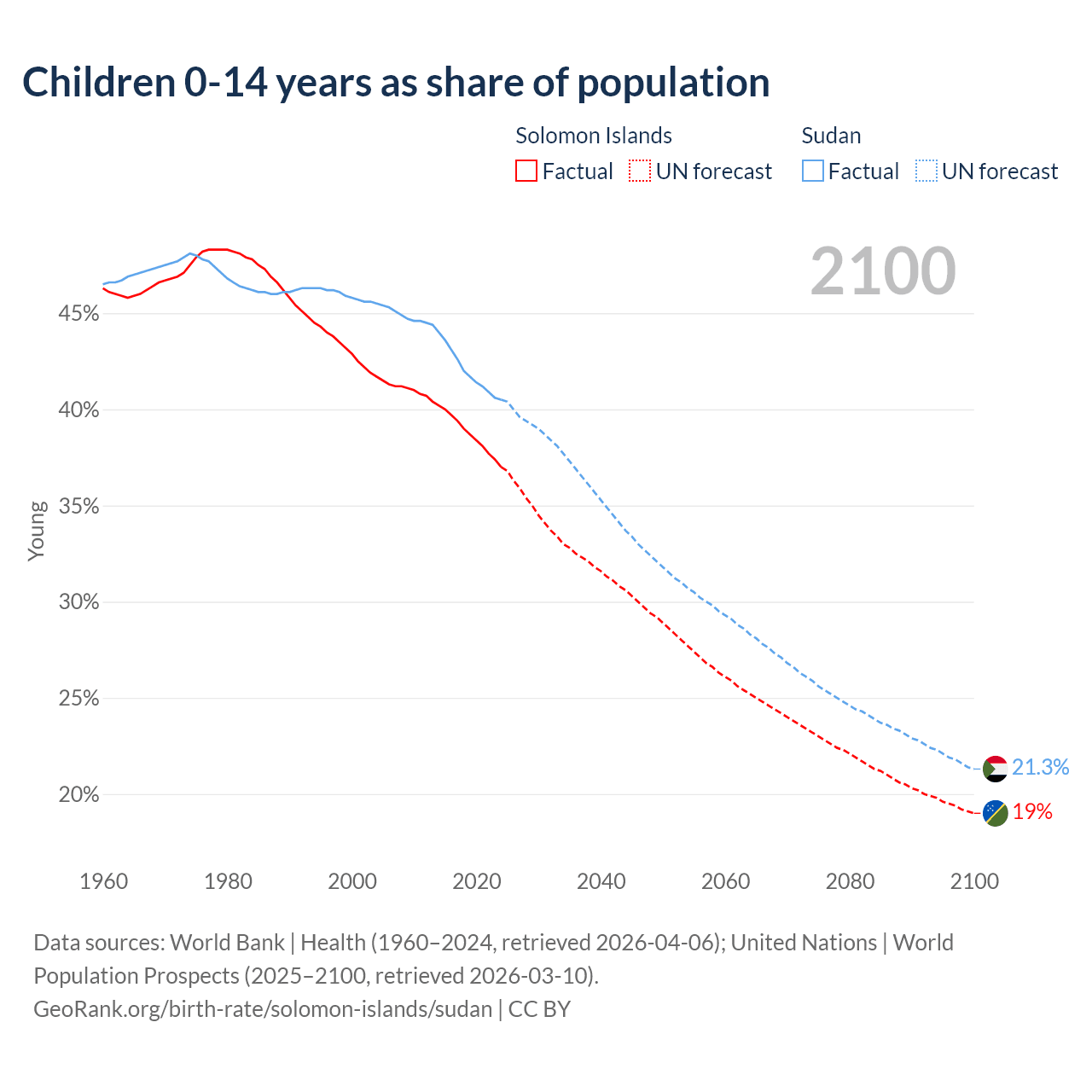 According to the latest available data on birth rates, the fertility rate in the Solomon Islands was 3.56 children per woman in 2023, compared to 4.32 in Sudan in 2023. The replacement level is considered to be 2.1 children per woman.