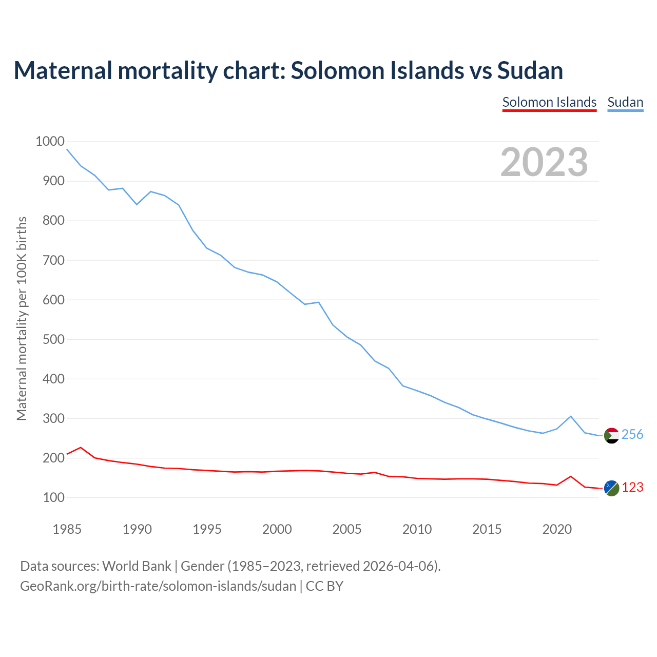 The maternal mortality rate, which is the probability of dying during childbirth or within 42 days of pregnancy termination, is 123 deaths per 100,000 live births in the Solomon Islands, compared to 256 deaths in Sudan.