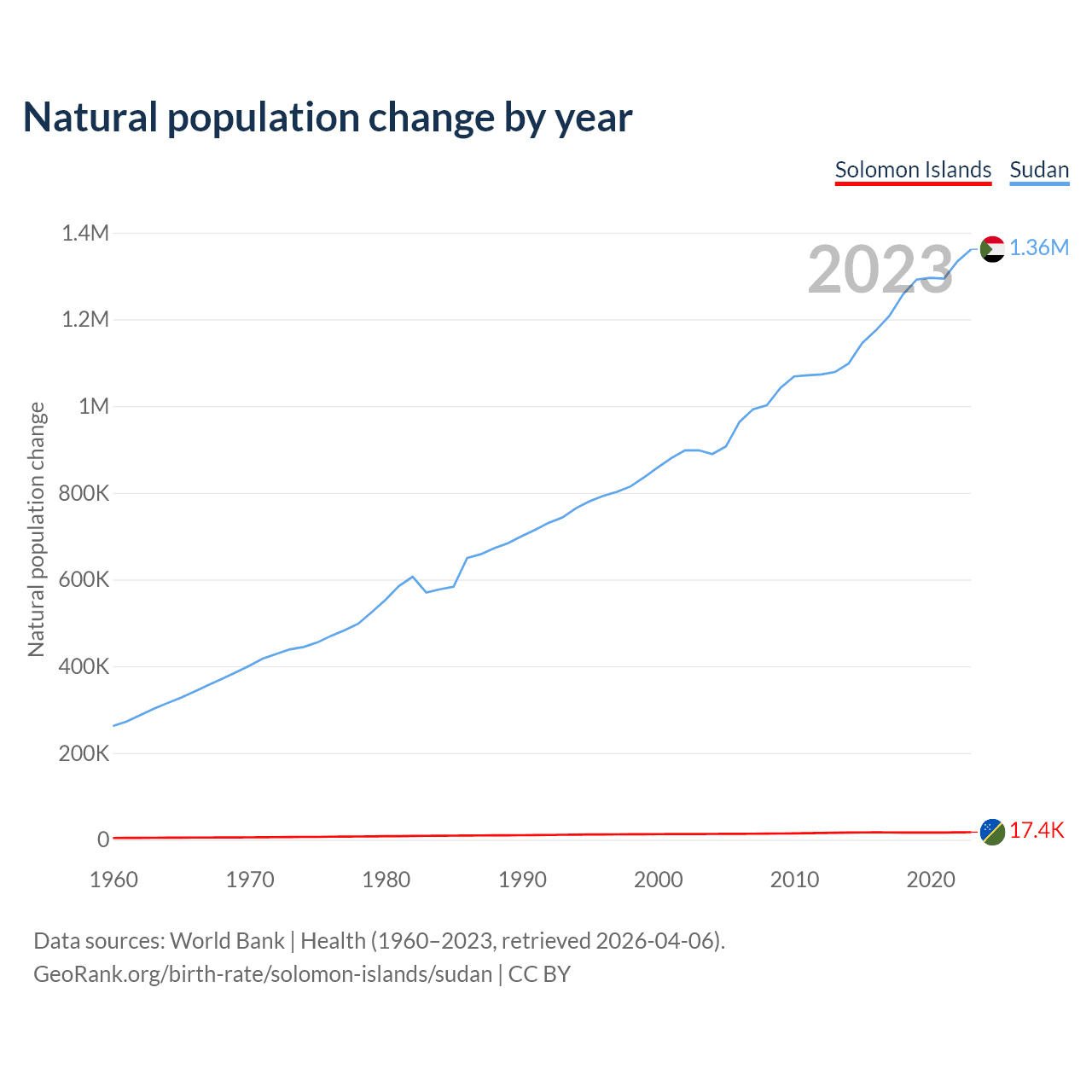 The Solomon Islands has an annual birth rate of 26.9 births per 1,000 people, compared to 33.6 for Sudan. The average number of children a woman is expected to have during her lifetime — the fertility rate, is 3.56 in the Solomon Islands and 4.32 in Sudan — 21.5% difference.