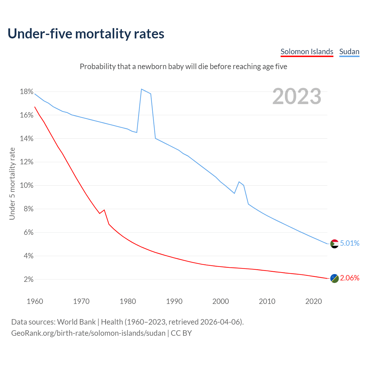 The chance that a newborn baby will die before reaching age five is 2.06% in the Solomon Islands and 5.01% in Sudan. Above is a chart with historical data on under-five mortality rates.