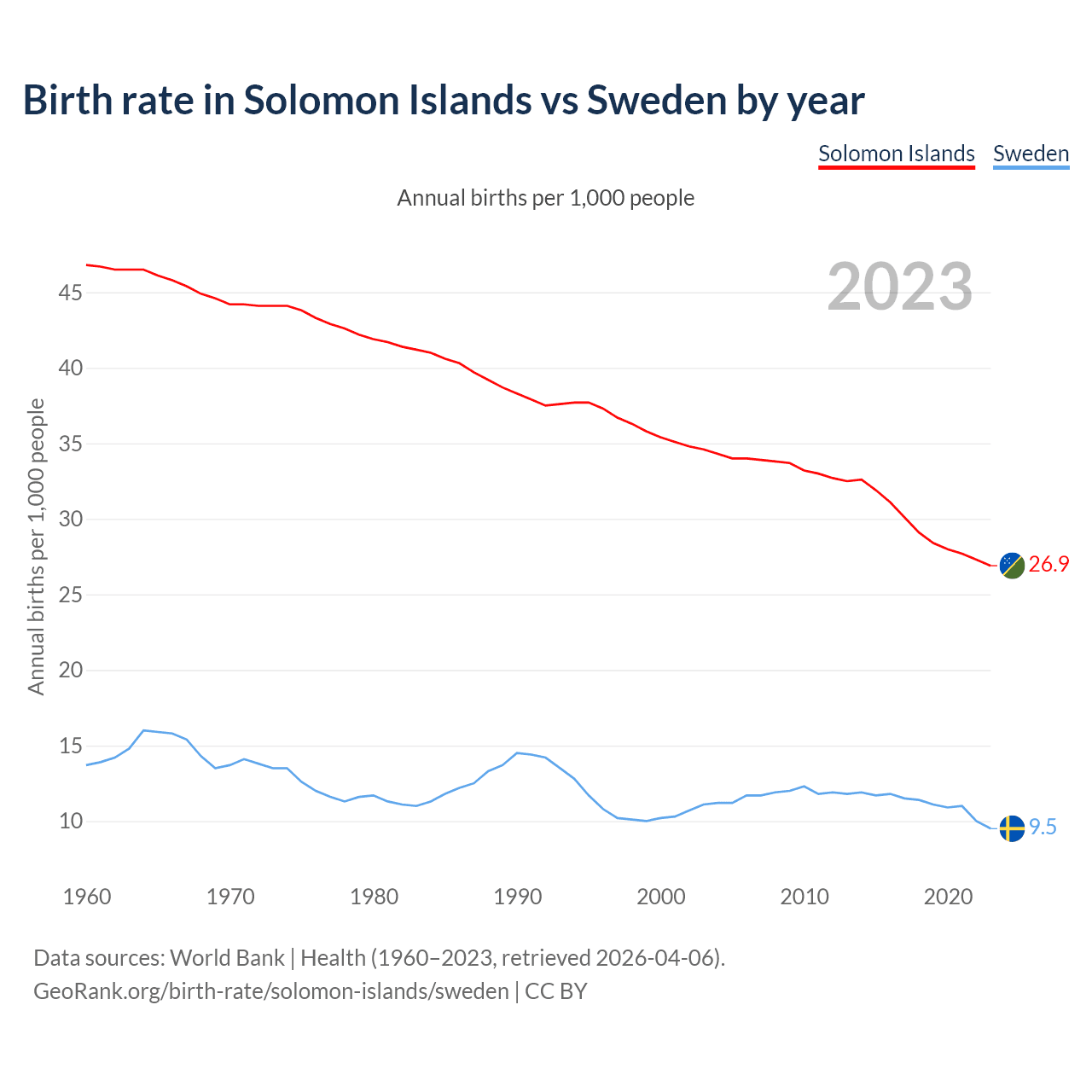 The Solomon Islands has an annual birth rate of 26.9 births per 1,000 people, compared to 9.5 for Sweden. The average number of children a woman is expected to have during her lifetime — the fertility rate, is 3.56 in the Solomon Islands and 1.45 in Sweden — 59.2% difference.