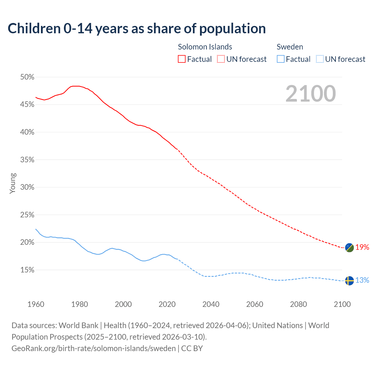 According to the latest available data on birth rates, the fertility rate in the Solomon Islands was 3.56 children per woman in 2023, compared to 1.45 in Sweden in 2023. The replacement level is considered to be 2.1 children per woman.