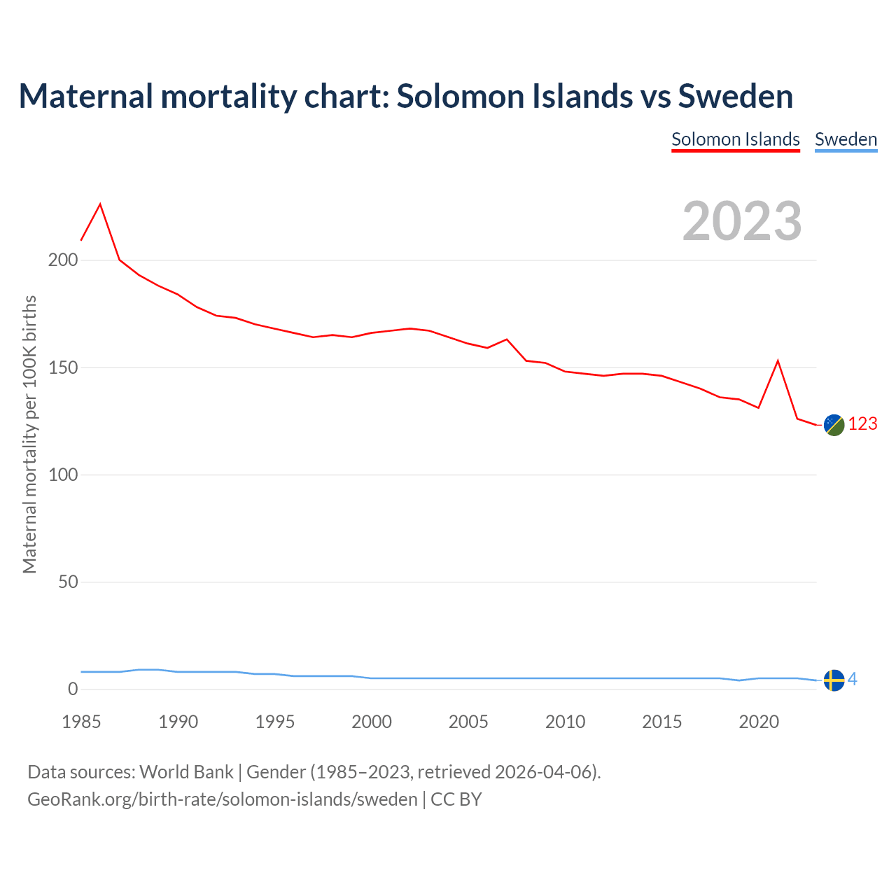 The maternal mortality rate, which is the probability of dying during childbirth or within 42 days of pregnancy termination, is 123 deaths per 100,000 live births in the Solomon Islands, compared to 4 deaths in Sweden.