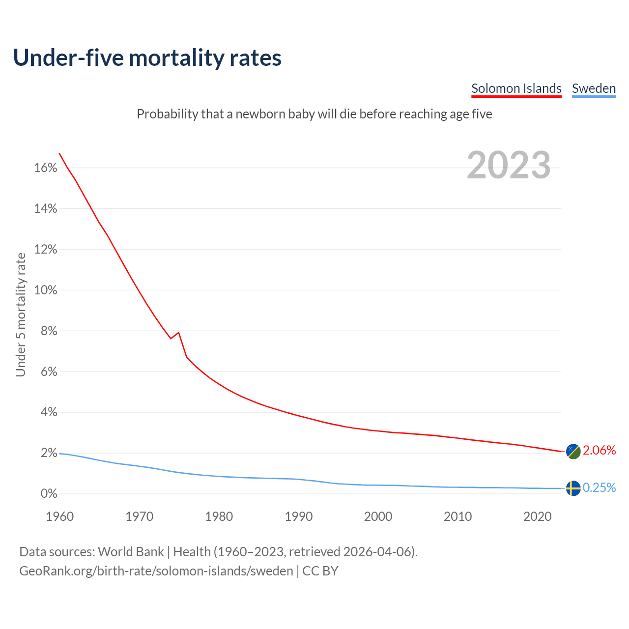 The chance that a newborn baby will die before reaching age five is 2.06% in the Solomon Islands and 0.25% in Sweden. Above is a chart with historical data on under-five mortality rates.