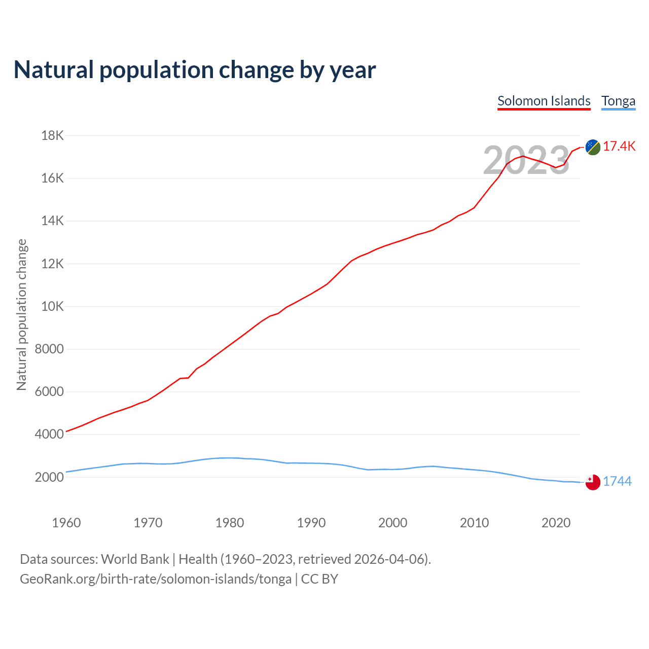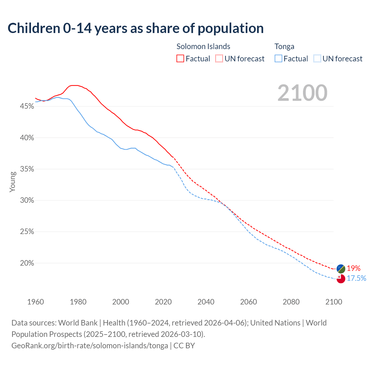 According to the latest available data on birth rates, the fertility rate in the Solomon Islands was 3.56 children per woman in 2023, compared to 3.13 in Tonga in 2023. The replacement level is considered to be 2.1 children per woman.