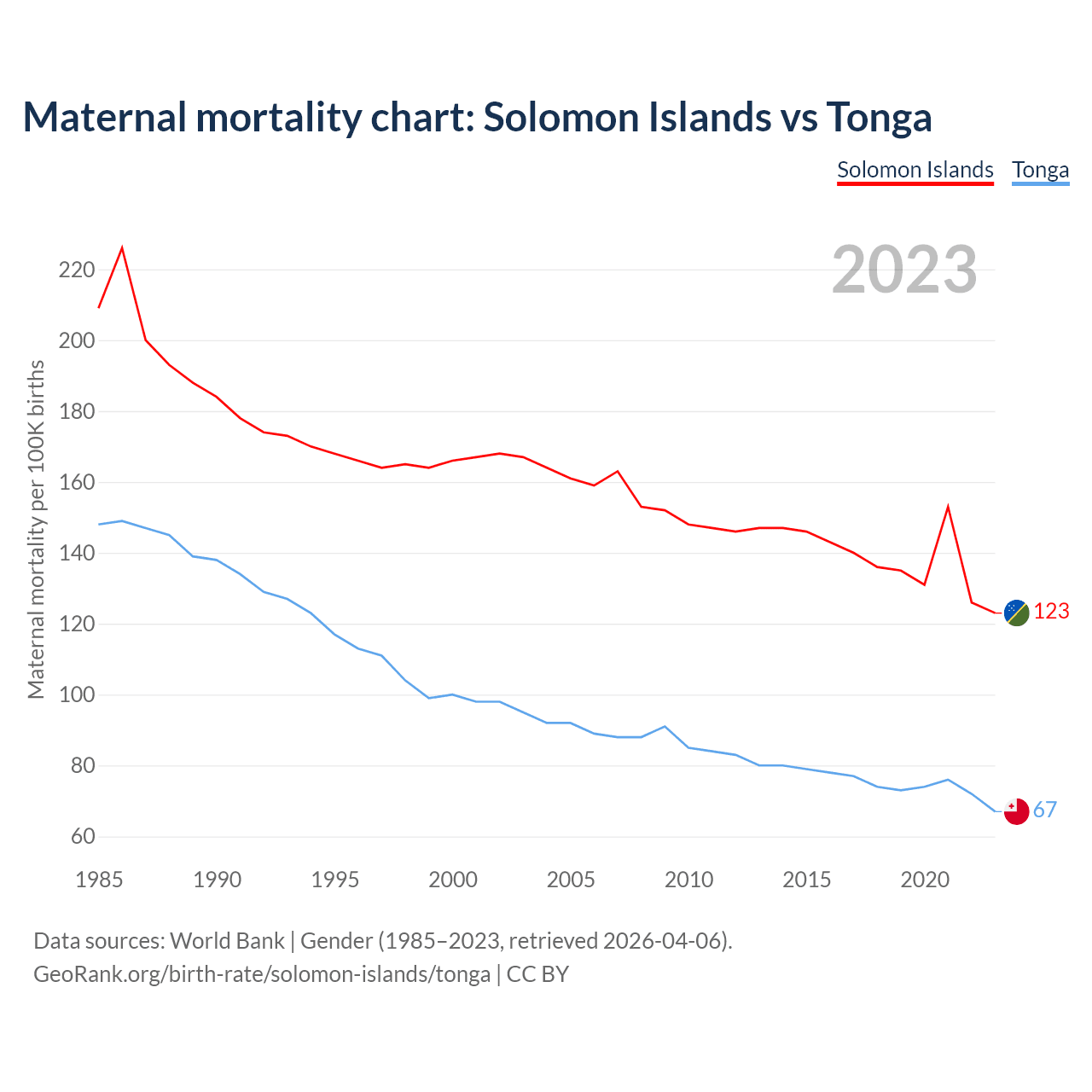 The maternal mortality rate, which is the probability of dying during childbirth or within 42 days of pregnancy termination, is 123 deaths per 100,000 live births in the Solomon Islands, compared to 67 deaths in Tonga.