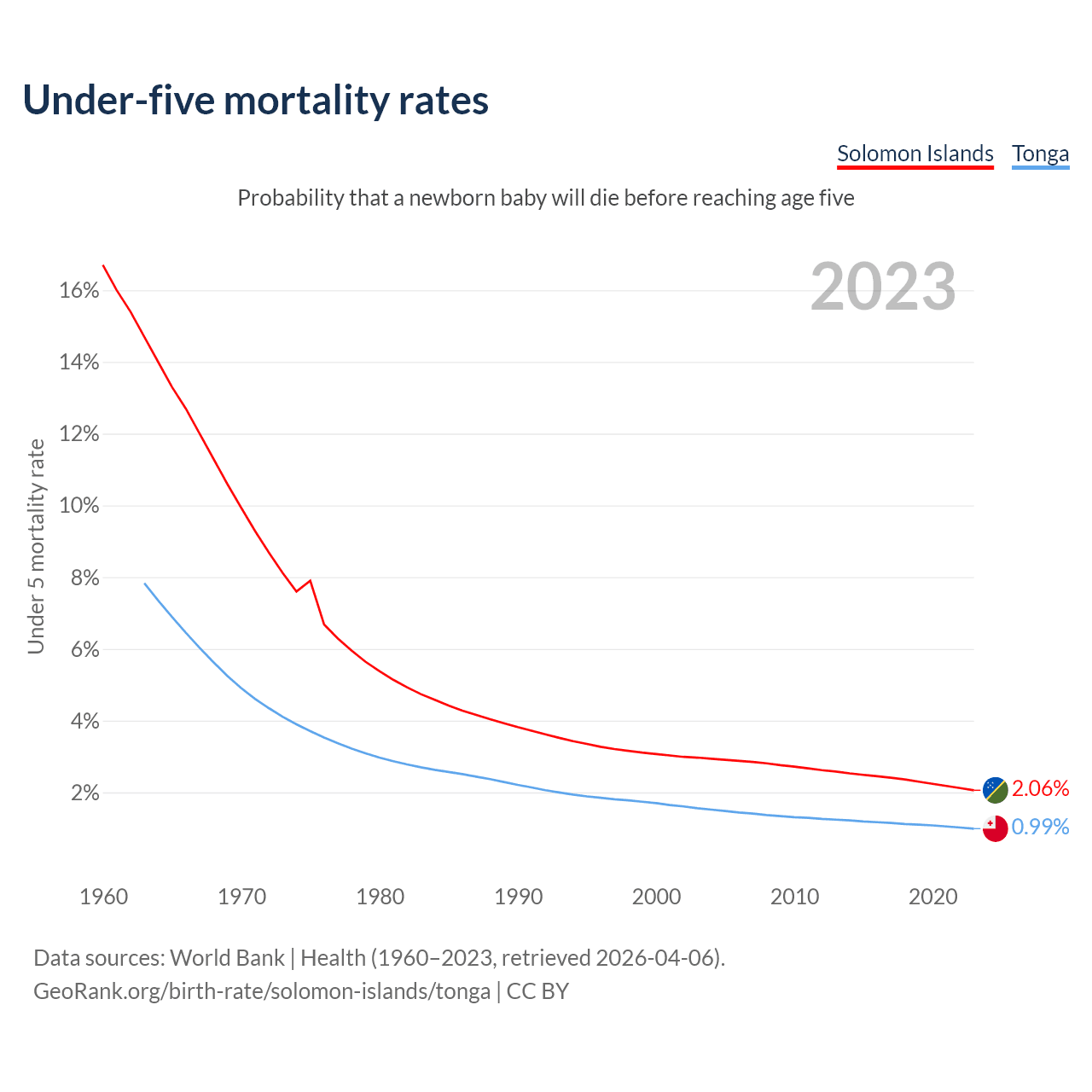 The chance that a newborn baby will die before reaching age five is 2.06% in the Solomon Islands and 0.99% in Tonga. Above is a chart with historical data on under-five mortality rates.