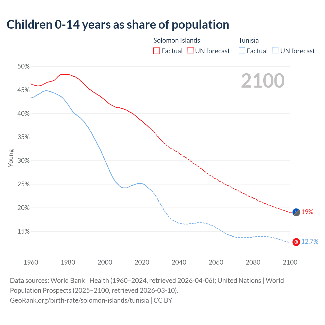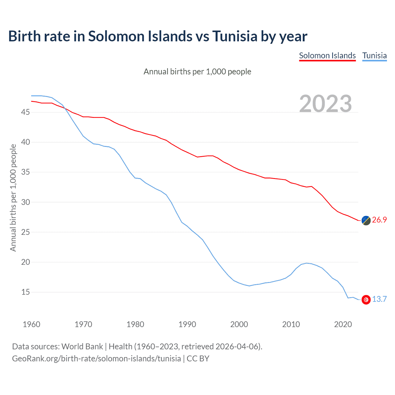 The Solomon Islands has an annual birth rate of 26.9 births per 1,000 people, compared to 13.7 for Tunisia. The average number of children a woman is expected to have during her lifetime — the fertility rate, is 3.56 in the Solomon Islands and 1.83 in Tunisia — 48.5% difference.