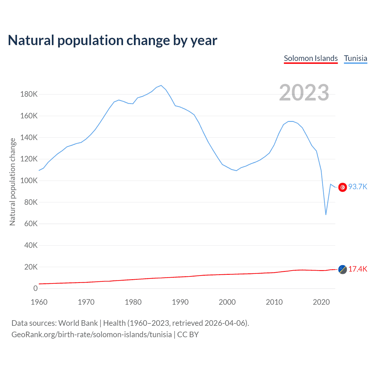 According to the latest available data on birth rates, the fertility rate in the Solomon Islands was 3.56 children per woman in 2023, compared to 1.83 in Tunisia in 2023. The replacement level is considered to be 2.1 children per woman.