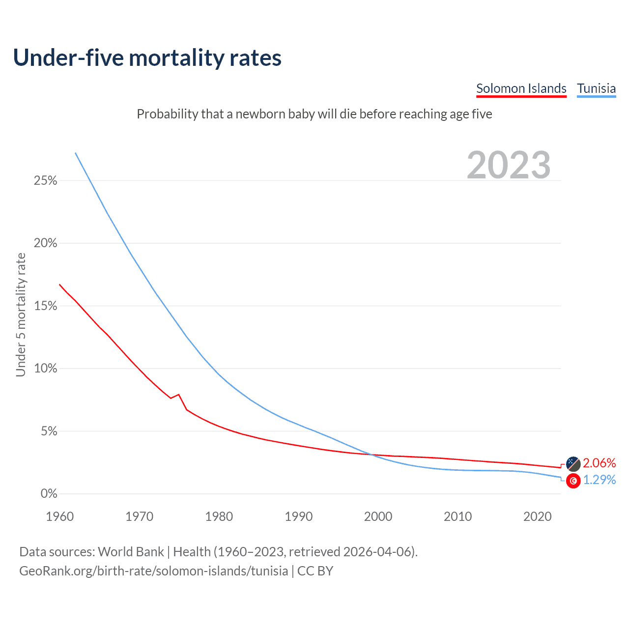 The chance that a newborn baby will die before reaching age five is 2.06% in the Solomon Islands and 1.29% in Tunisia. Above is a chart with historical data on under-five mortality rates.