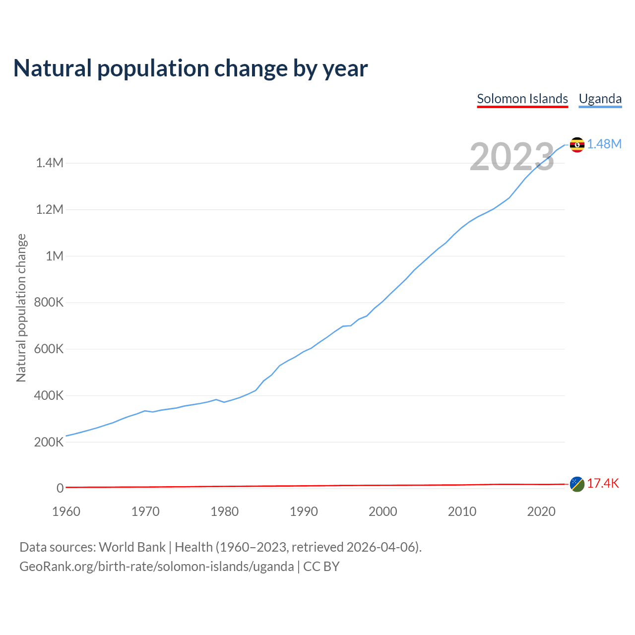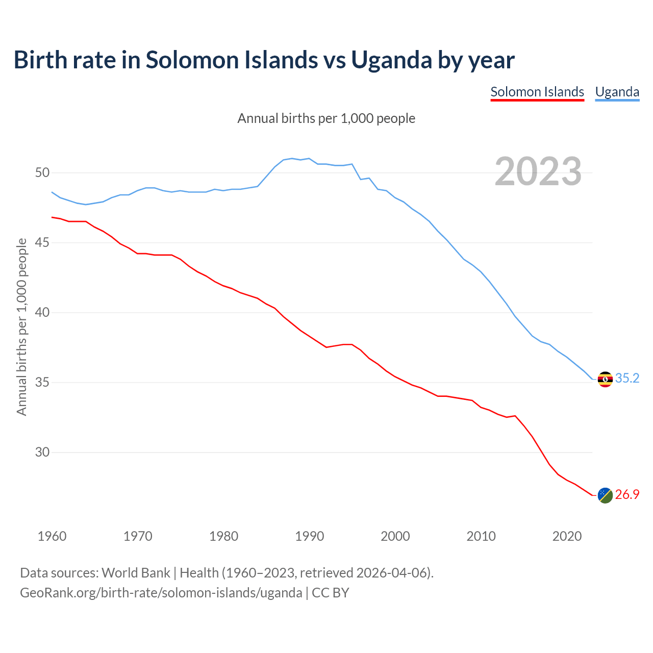 The Solomon Islands has an annual birth rate of 26.9 births per 1,000 people, compared to 35.2 for Uganda. The average number of children a woman is expected to have during her lifetime — the fertility rate, is 3.56 in the Solomon Islands and 4.28 in Uganda — 20.4% difference.