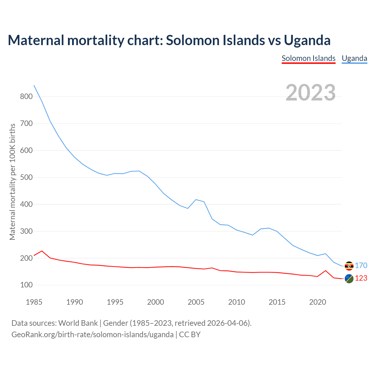 The maternal mortality rate, which is the probability of dying during childbirth or within 42 days of pregnancy termination, is 123 deaths per 100,000 live births in the Solomon Islands, compared to 170 deaths in Uganda.