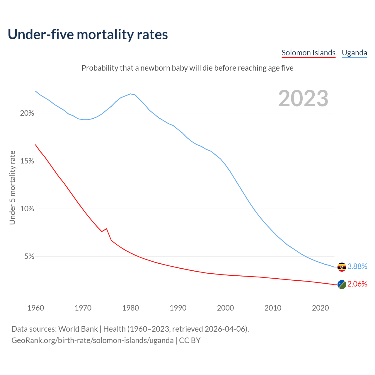 The chance that a newborn baby will die before reaching age five is 2.06% in the Solomon Islands and 3.88% in Uganda. Above is a chart with historical data on under-five mortality rates.