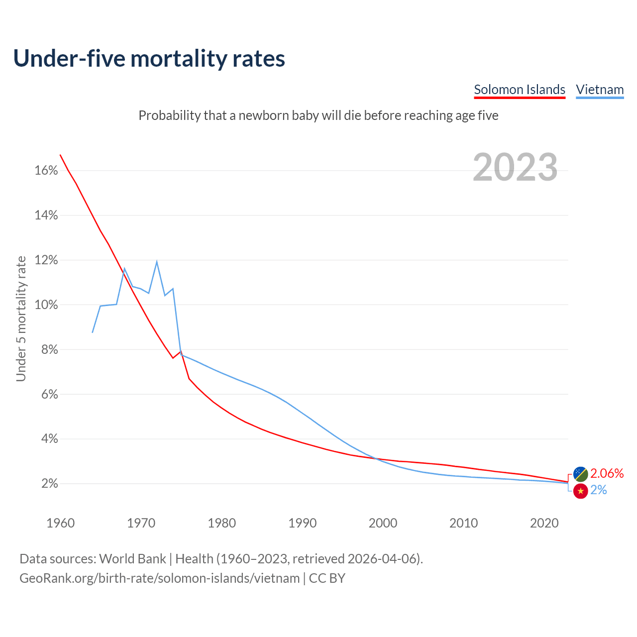 The chance that a newborn baby will die before reaching age five is 2.06% in the Solomon Islands and 2% in Vietnam. Above is a chart with historical data on under-five mortality rates.