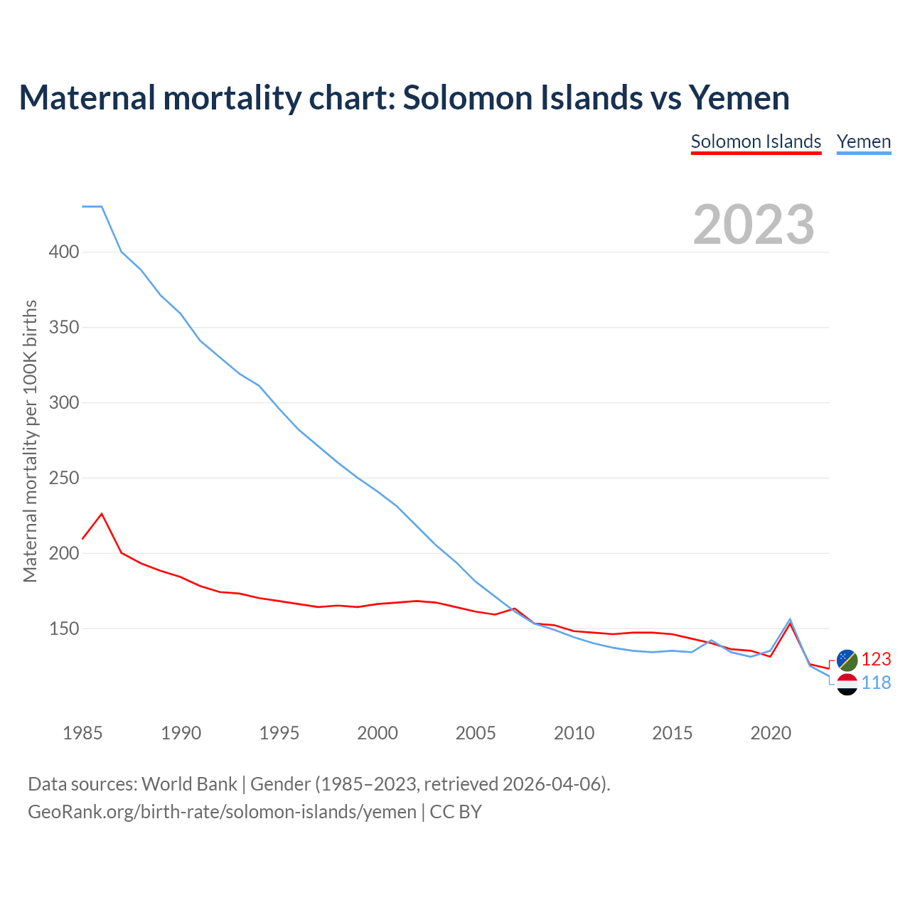 The maternal mortality rate, which is the probability of dying during childbirth or within 42 days of pregnancy termination, is 123 deaths per 100,000 live births in the Solomon Islands, compared to 118 deaths in Yemen.