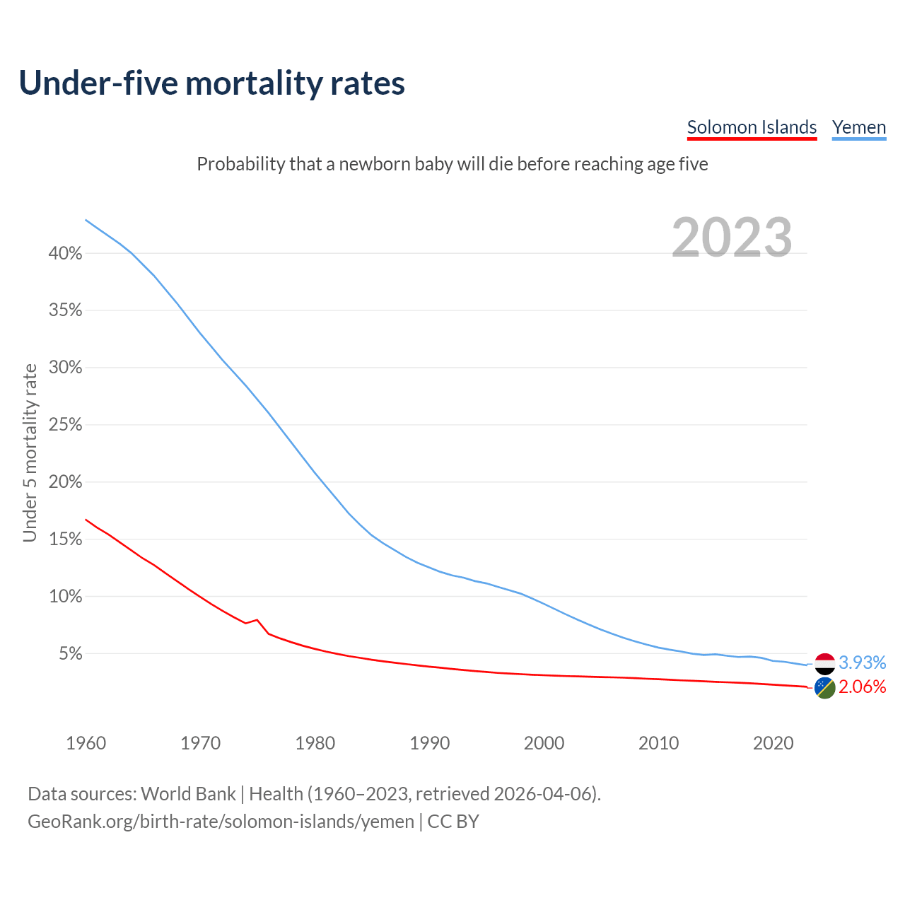 The chance that a newborn baby will die before reaching age five is 2.06% in the Solomon Islands and 3.93% in Yemen. Above is a chart with historical data on under-five mortality rates.