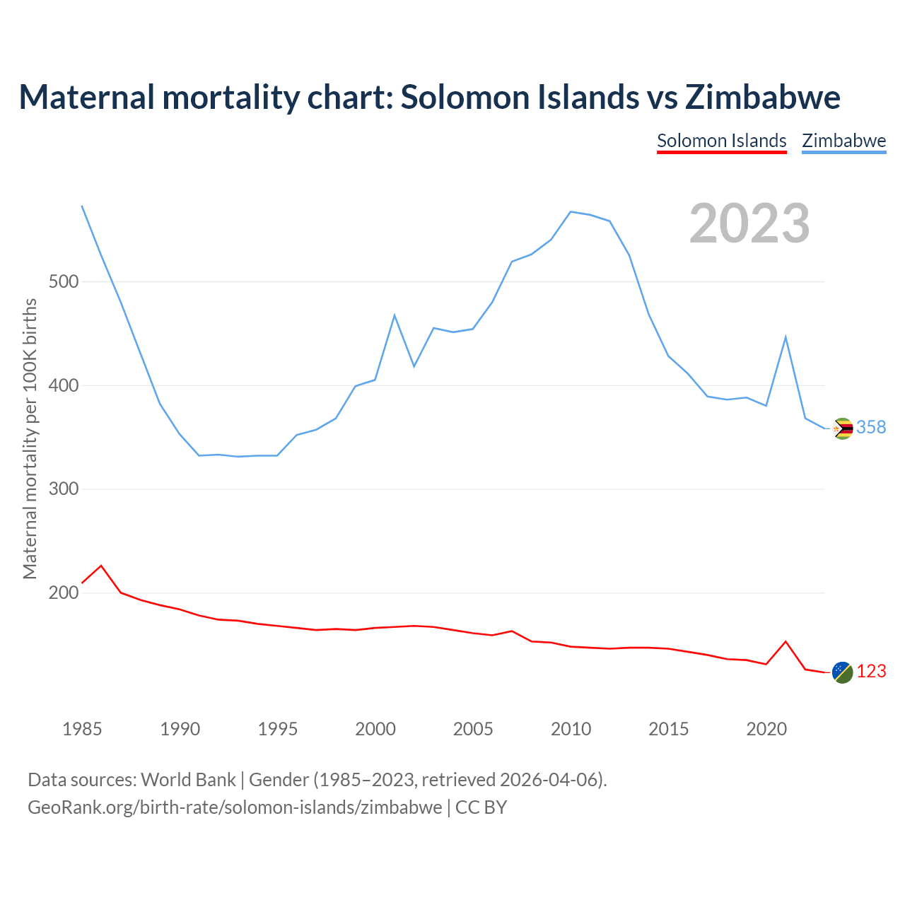 The maternal mortality rate, which is the probability of dying during childbirth or within 42 days of pregnancy termination, is 123 deaths per 100,000 live births in the Solomon Islands, compared to 358 deaths in Zimbabwe.