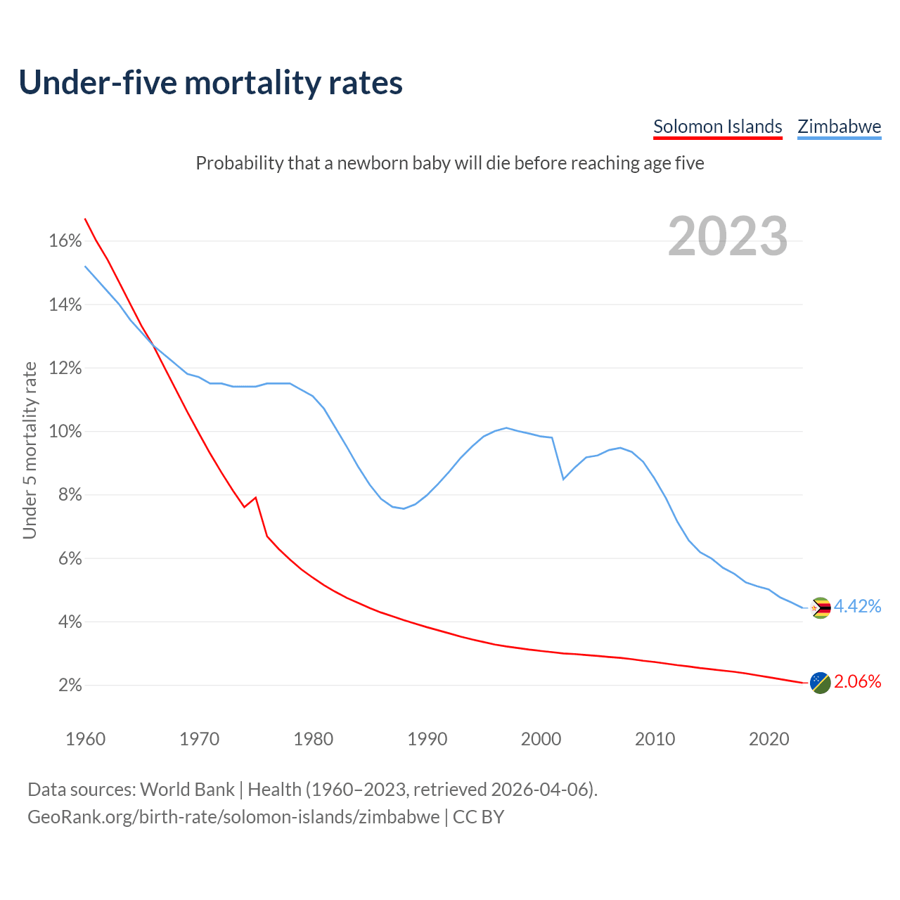 The chance that a newborn baby will die before reaching age five is 2.06% in the Solomon Islands and 4.42% in Zimbabwe. Above is a chart with historical data on under-five mortality rates.
