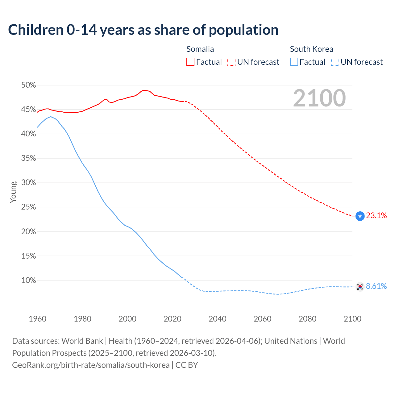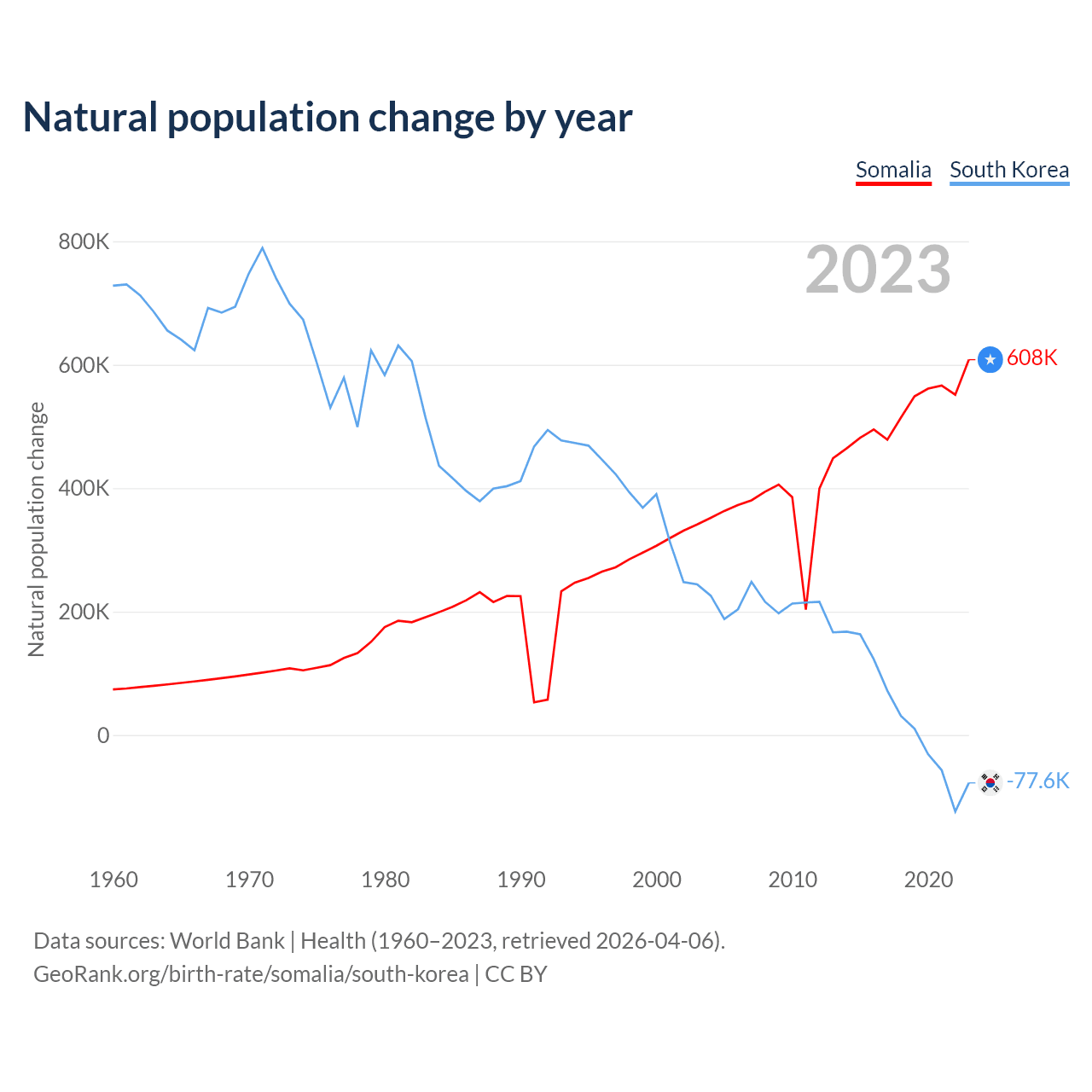 According to the latest available data on birth rates, the fertility rate in Somalia was 6.13 children per woman in 2023, compared to 0.72 in South Korea in 2023. The replacement level is considered to be 2.1 children per woman.