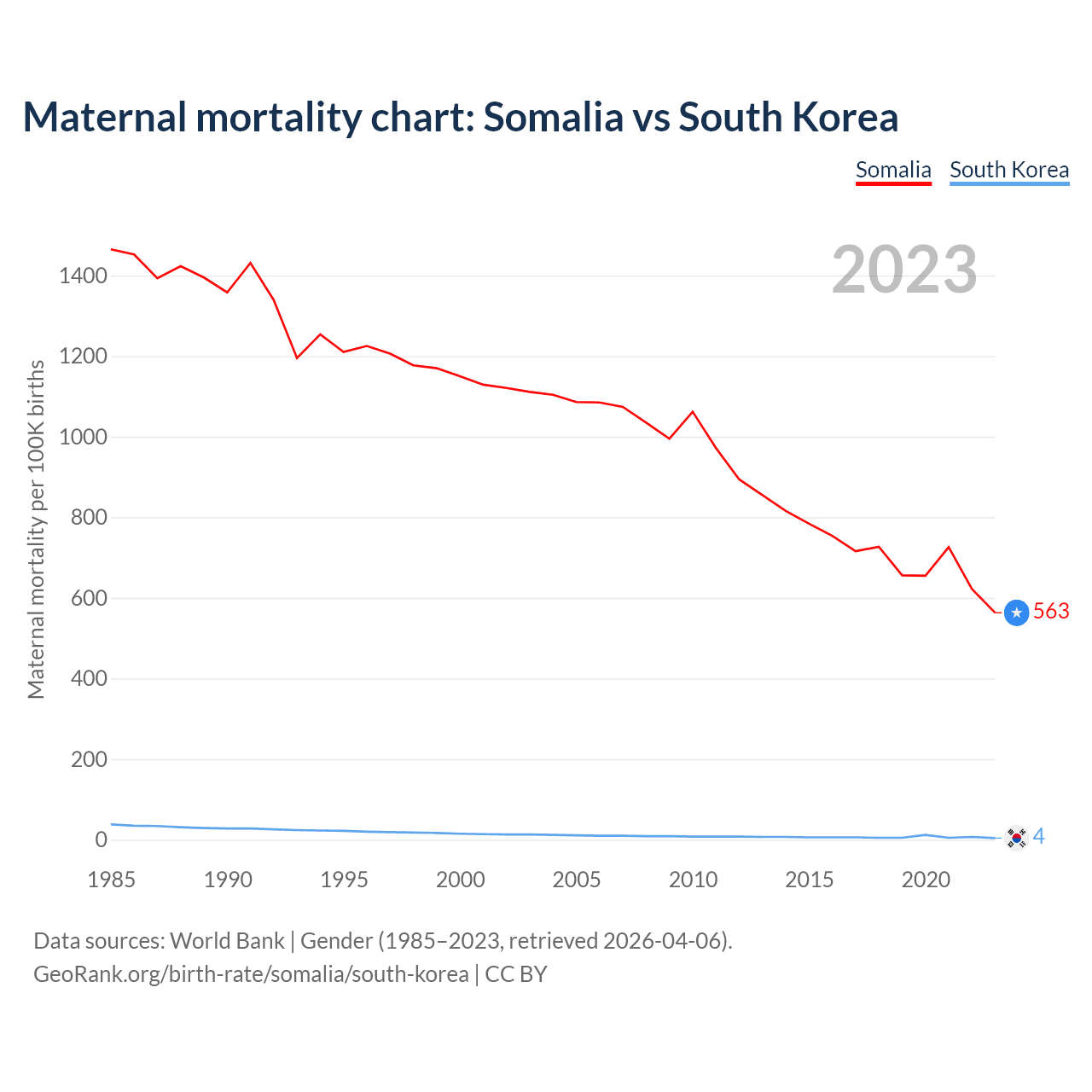 The maternal mortality rate, which is the probability of dying during childbirth or within 42 days of pregnancy termination, is 563 deaths per 100,000 live births in Somalia, compared to 4 deaths in South Korea.