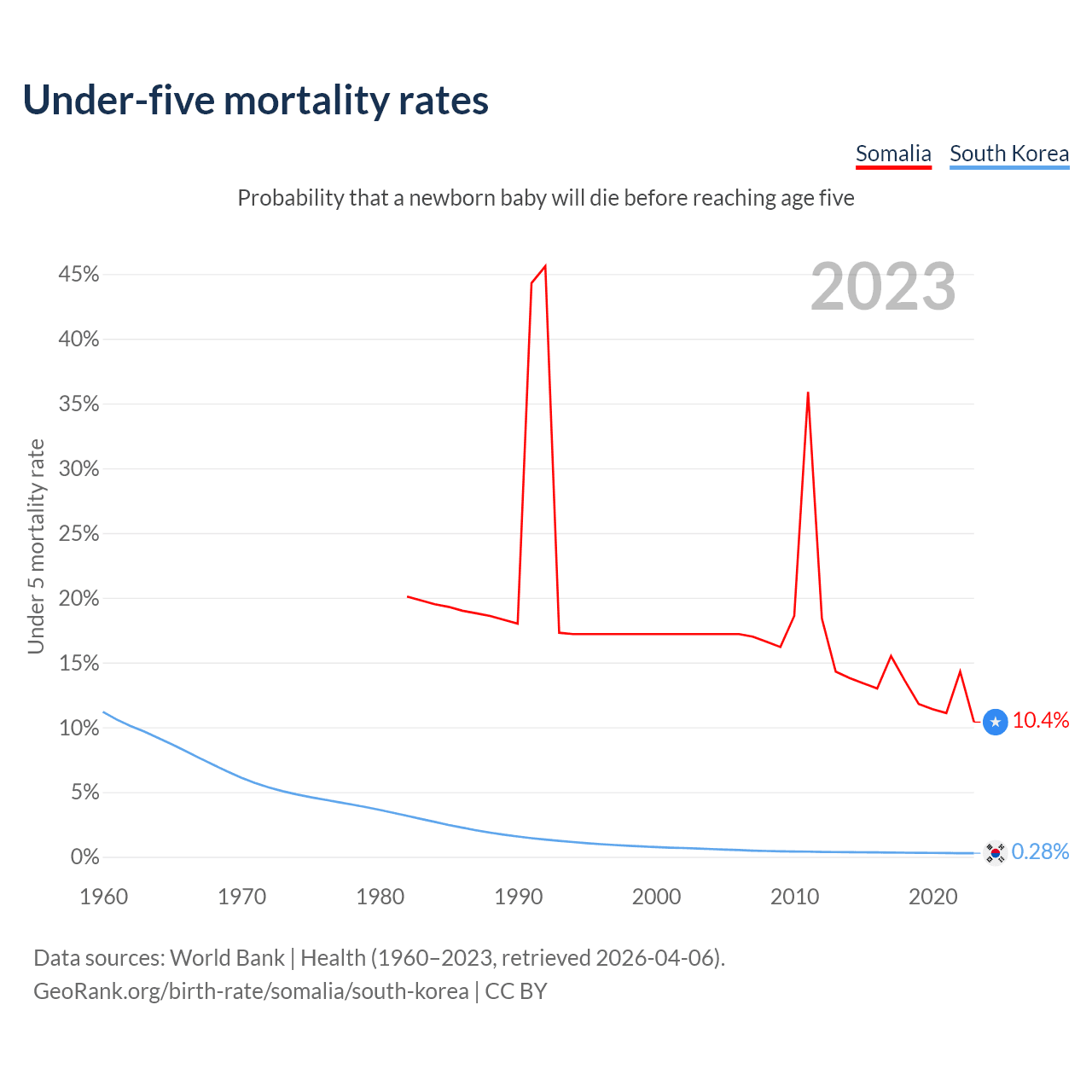The chance that a newborn baby will die before reaching age five is 10.4% in Somalia and 0.28% in South Korea. Above is a chart with historical data on under-five mortality rates.