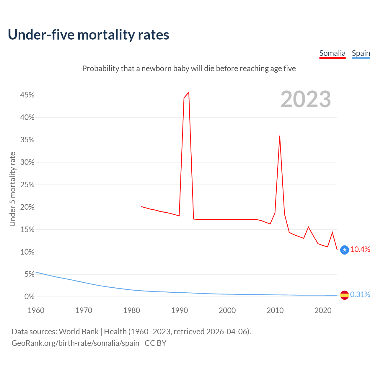 The chance that a newborn baby will die before reaching age five is 10.4% in Somalia and 0.31% in Spain. Above is a chart with historical data on under-five mortality rates.