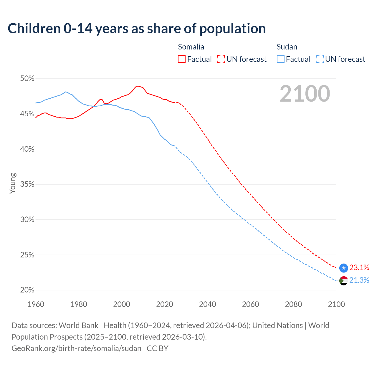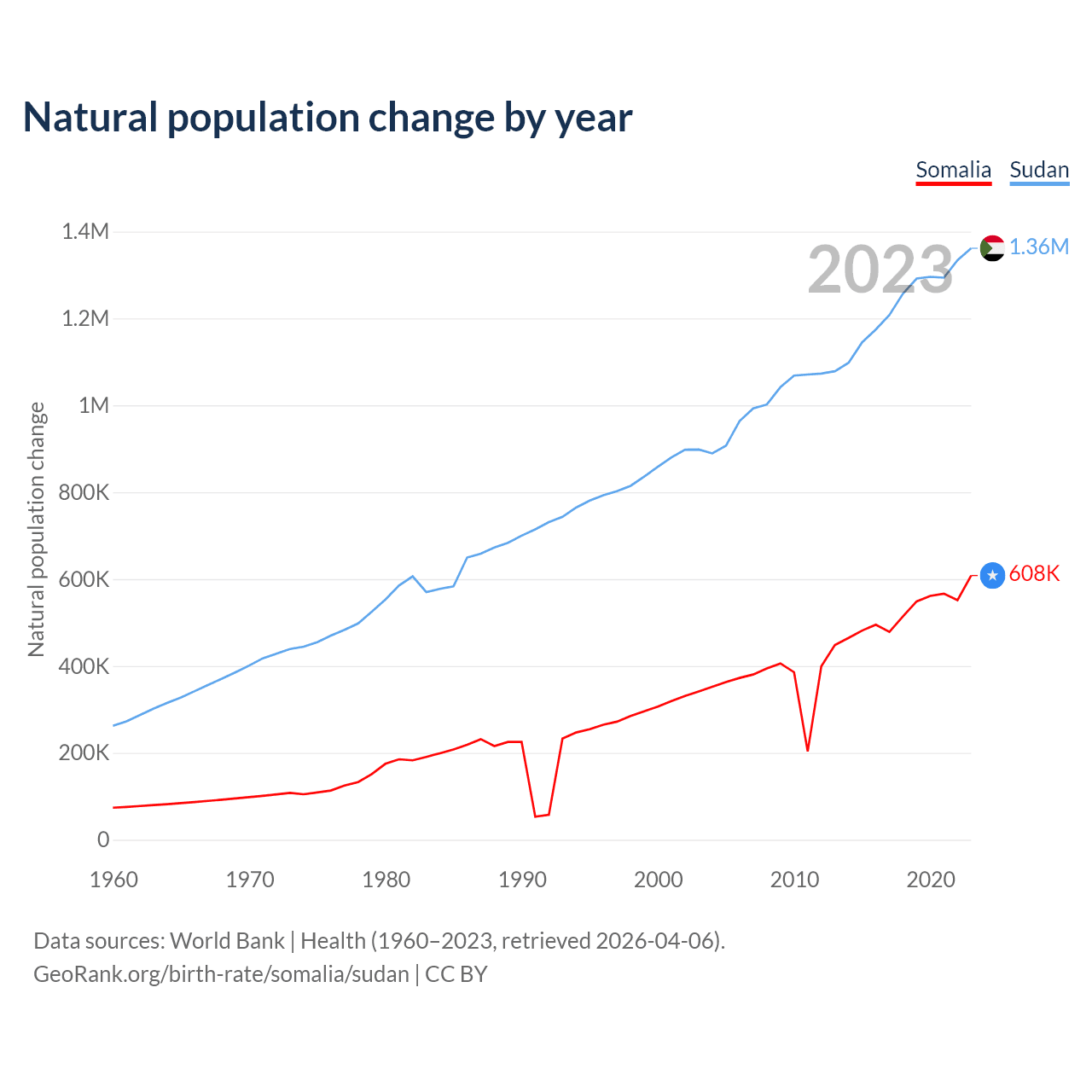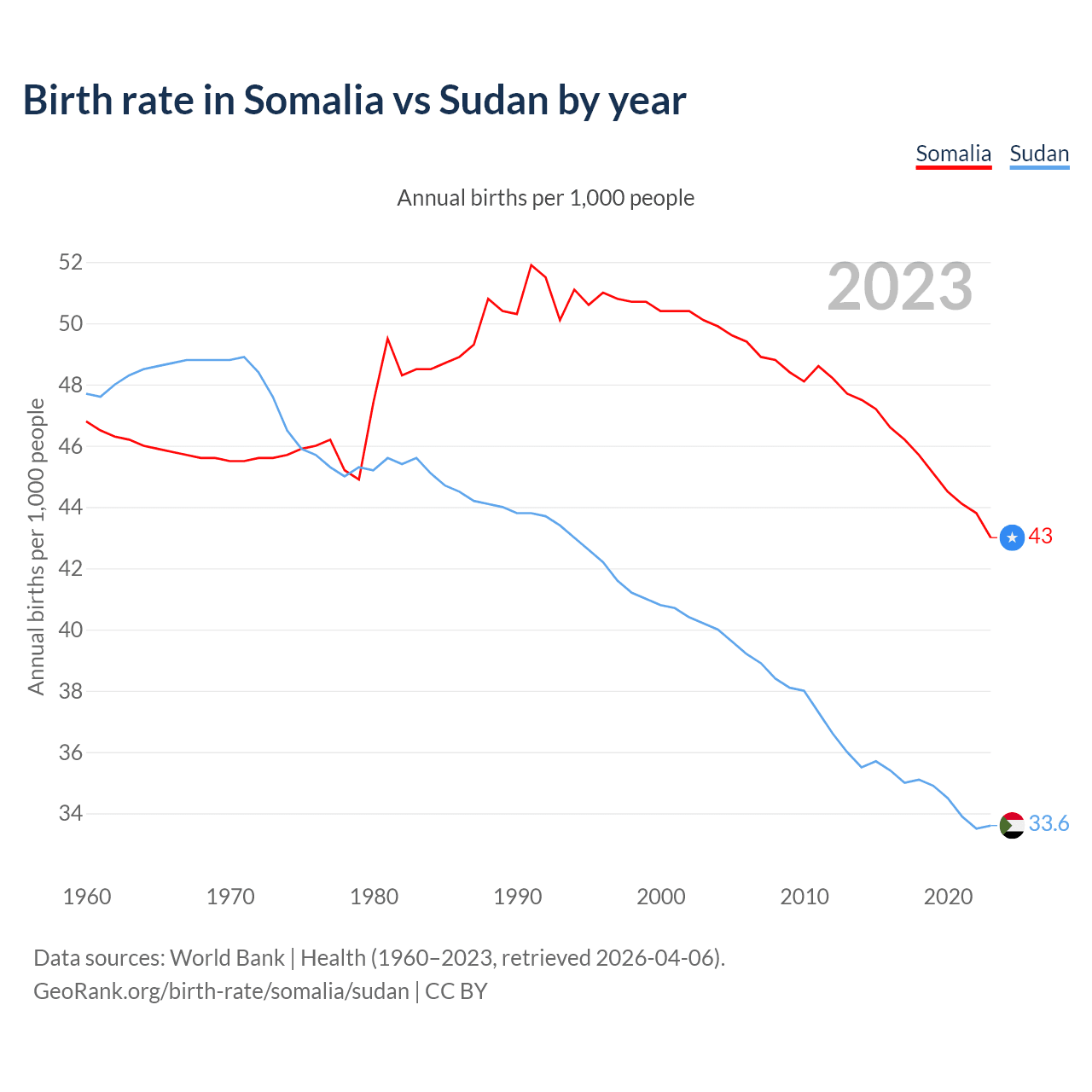 According to the latest available data on birth rates, the fertility rate in Somalia was 6.13 children per woman in 2023, compared to 4.32 in Sudan in 2023. The replacement level is considered to be 2.1 children per woman.