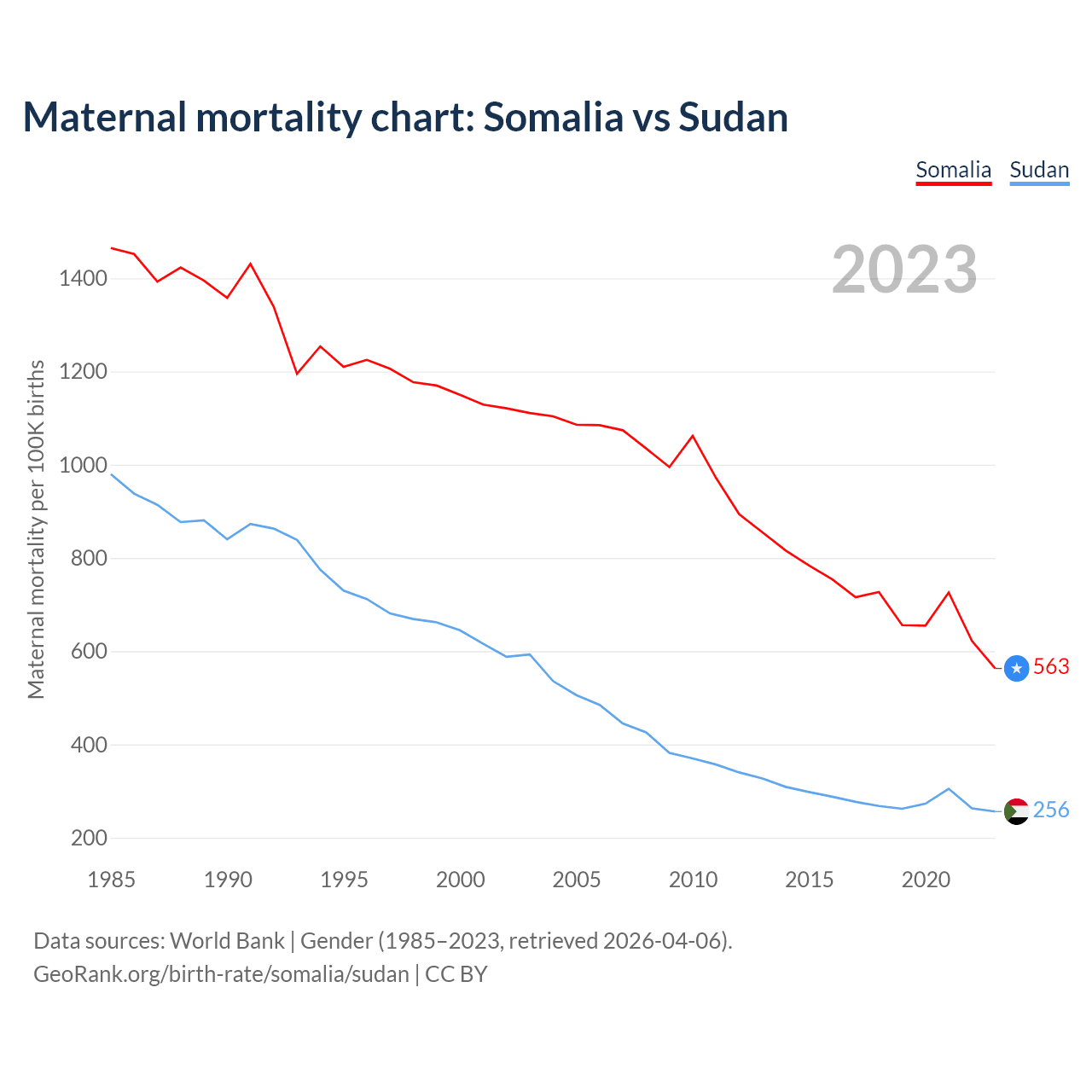 The maternal mortality rate, which is the probability of dying during childbirth or within 42 days of pregnancy termination, is 563 deaths per 100,000 live births in Somalia, compared to 256 deaths in Sudan.