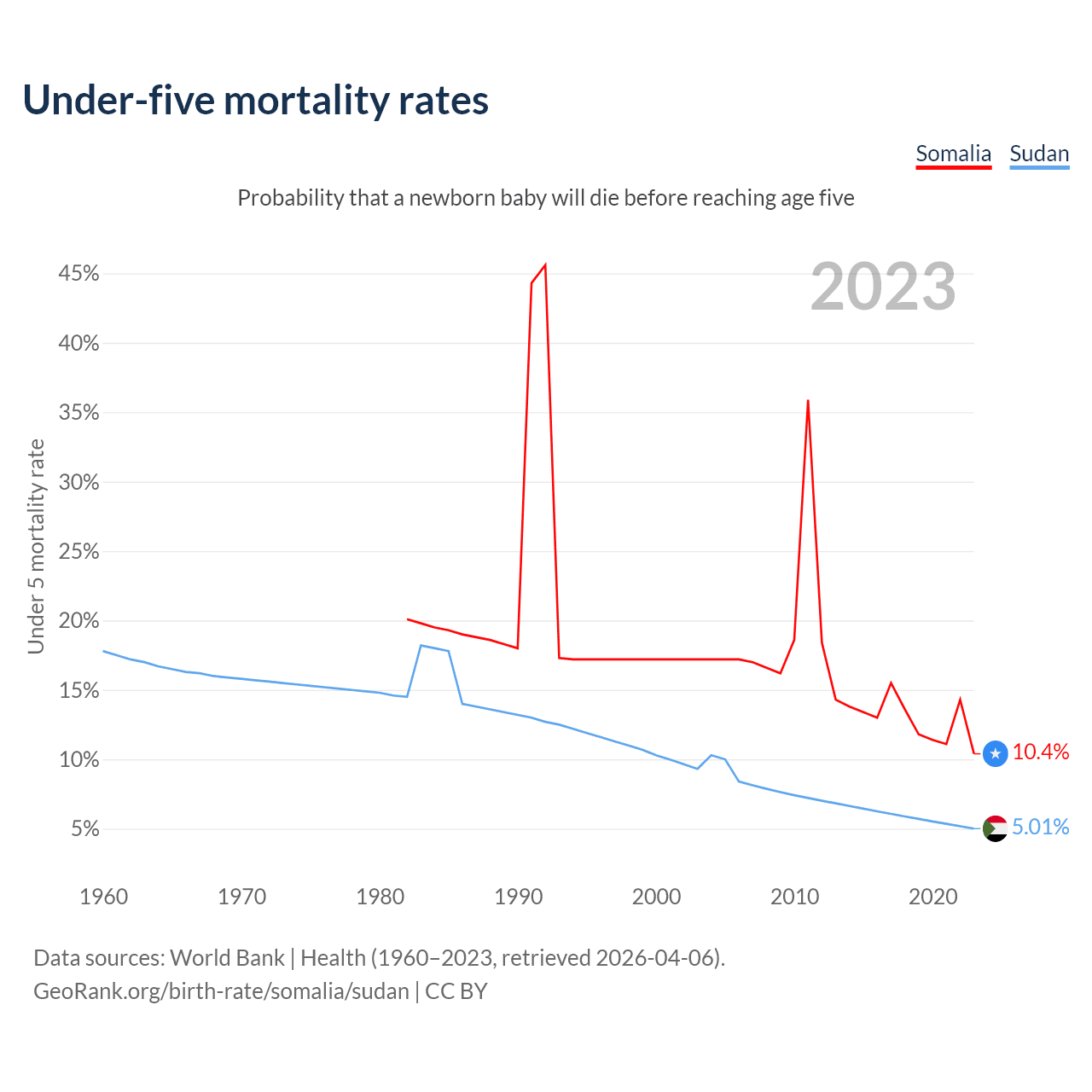 The chance that a newborn baby will die before reaching age five is 10.4% in Somalia and 5.01% in Sudan. Above is a chart with historical data on under-five mortality rates.
