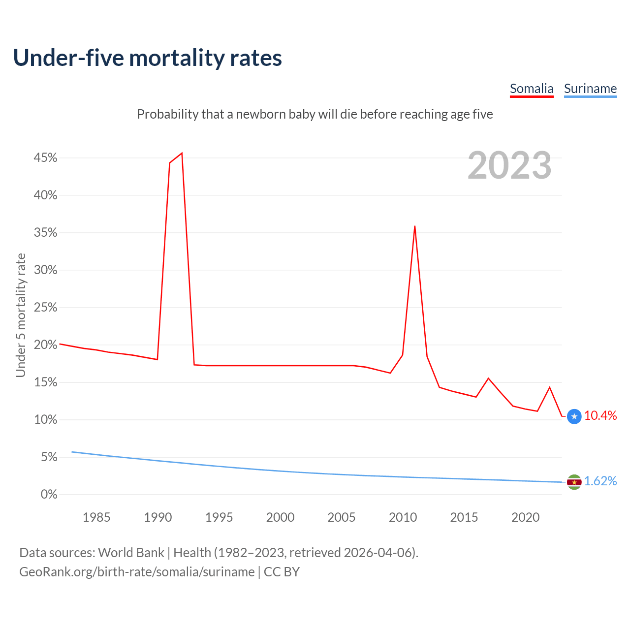 The chance that a newborn baby will die before reaching age five is 10.4% in Somalia and 1.62% in Suriname. Above is a chart with historical data on under-five mortality rates.