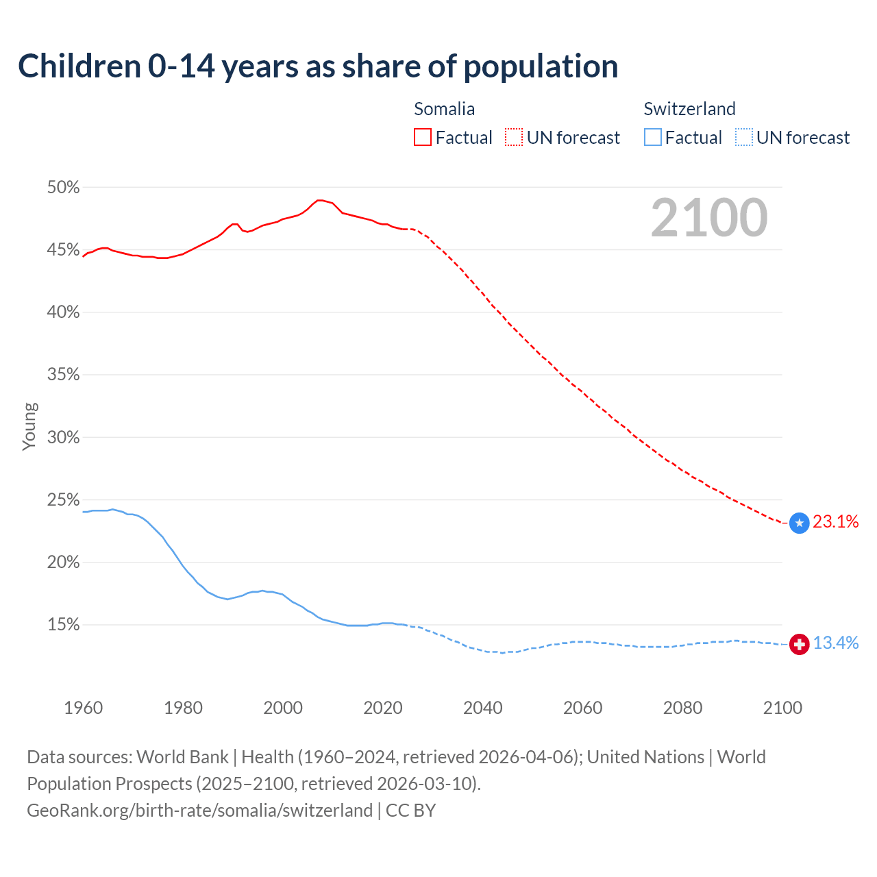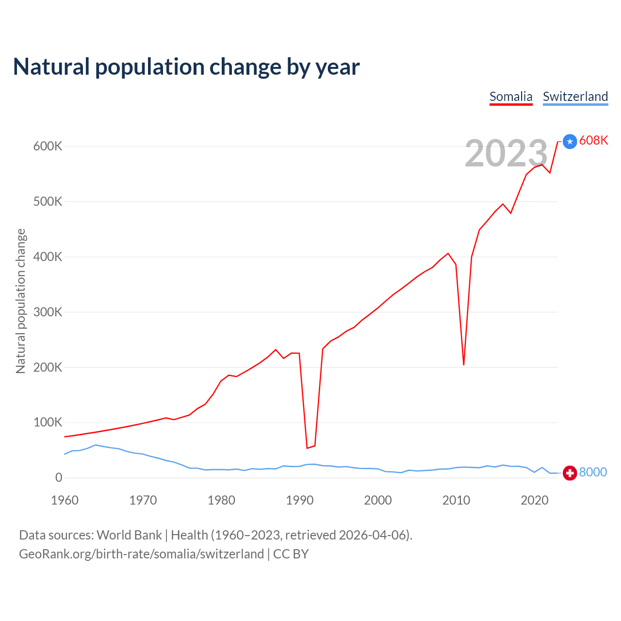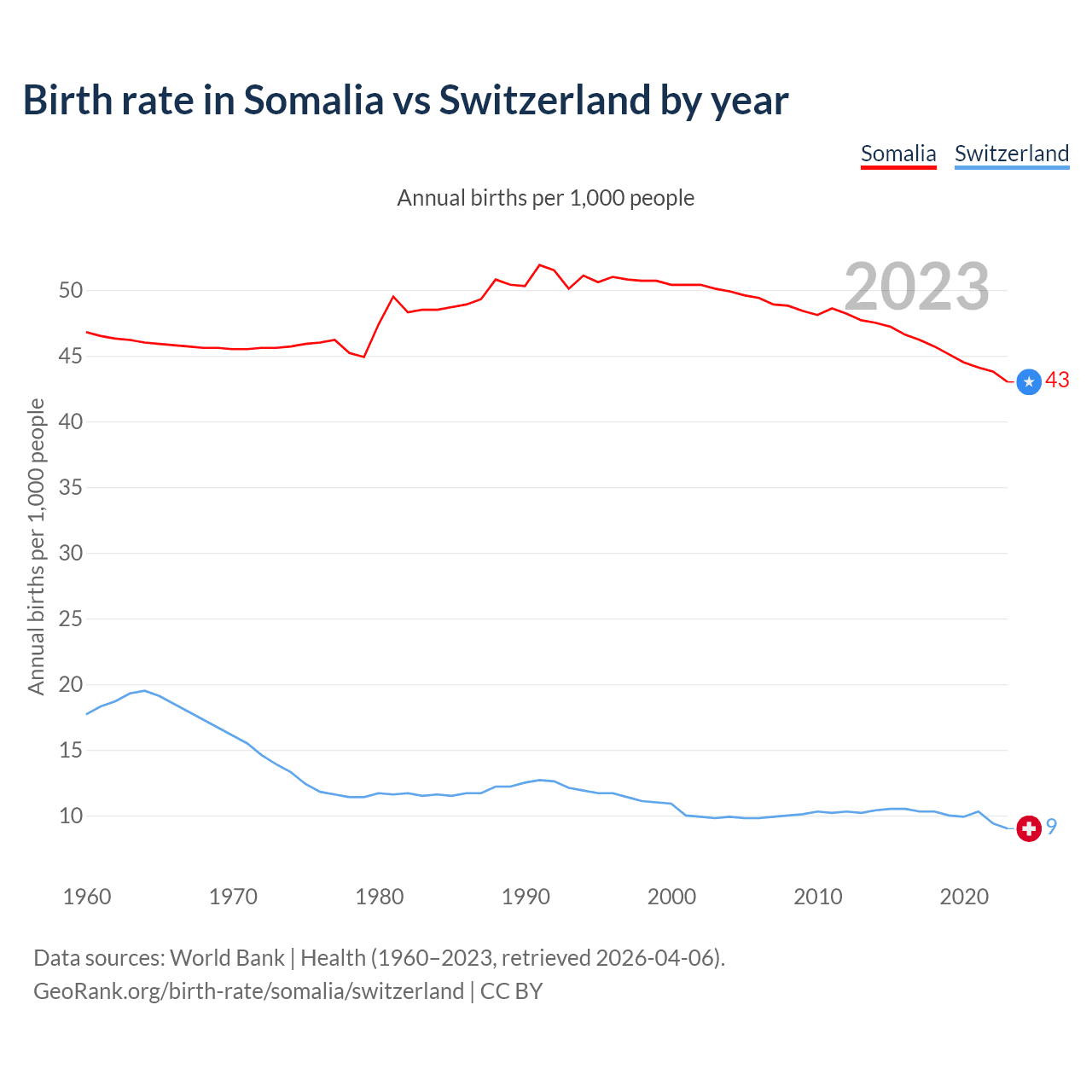 Somalia has an annual birth rate of 43 births per 1,000 people, compared to 9 for Switzerland. The average number of children a woman is expected to have during her lifetime — the fertility rate, is 6.13 in Somalia and 1.33 in Switzerland — 78.3% difference.