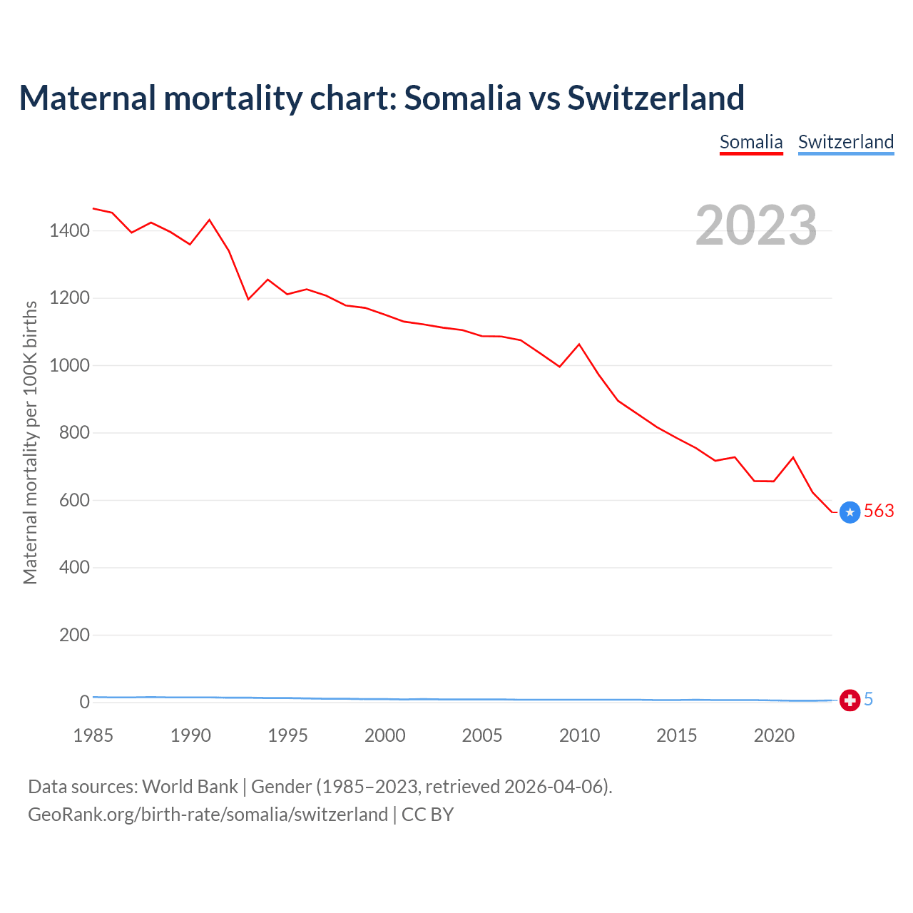 The maternal mortality rate, which is the probability of dying during childbirth or within 42 days of pregnancy termination, is 563 deaths per 100,000 live births in Somalia, compared to 5 deaths in Switzerland.