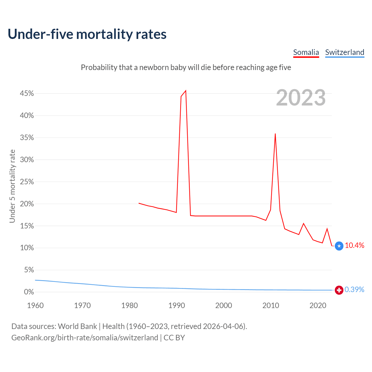 The chance that a newborn baby will die before reaching age five is 10.4% in Somalia and 0.39% in Switzerland. Above is a chart with historical data on under-five mortality rates.