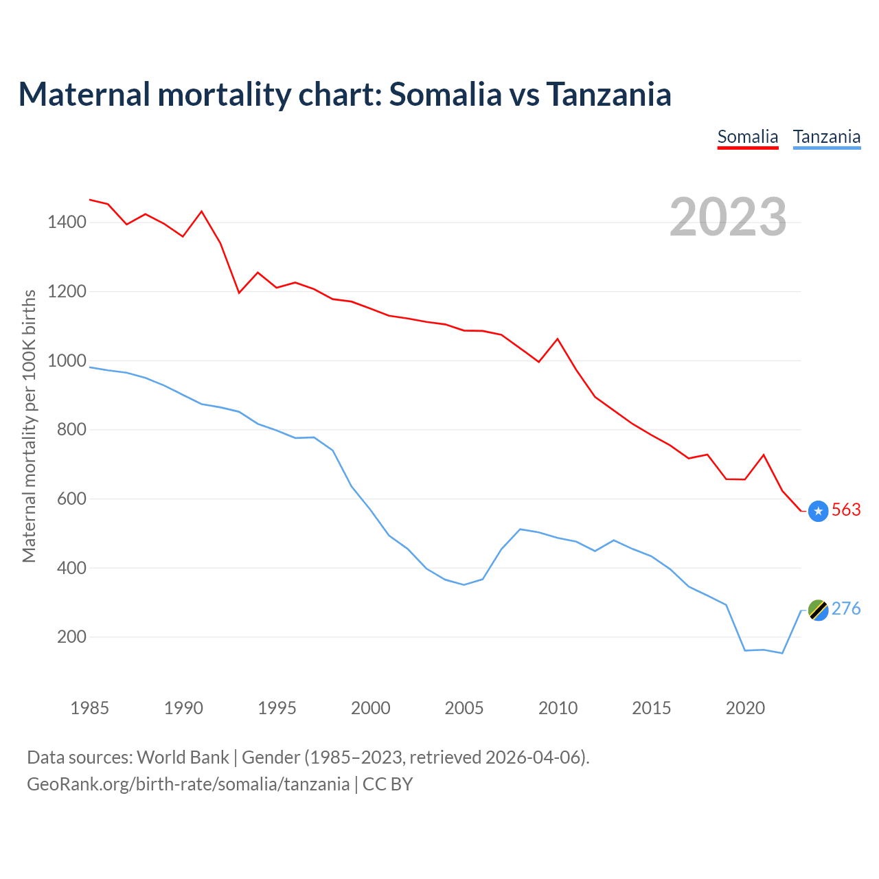 The maternal mortality rate, which is the probability of dying during childbirth or within 42 days of pregnancy termination, is 563 deaths per 100,000 live births in Somalia, compared to 276 deaths in Tanzania.