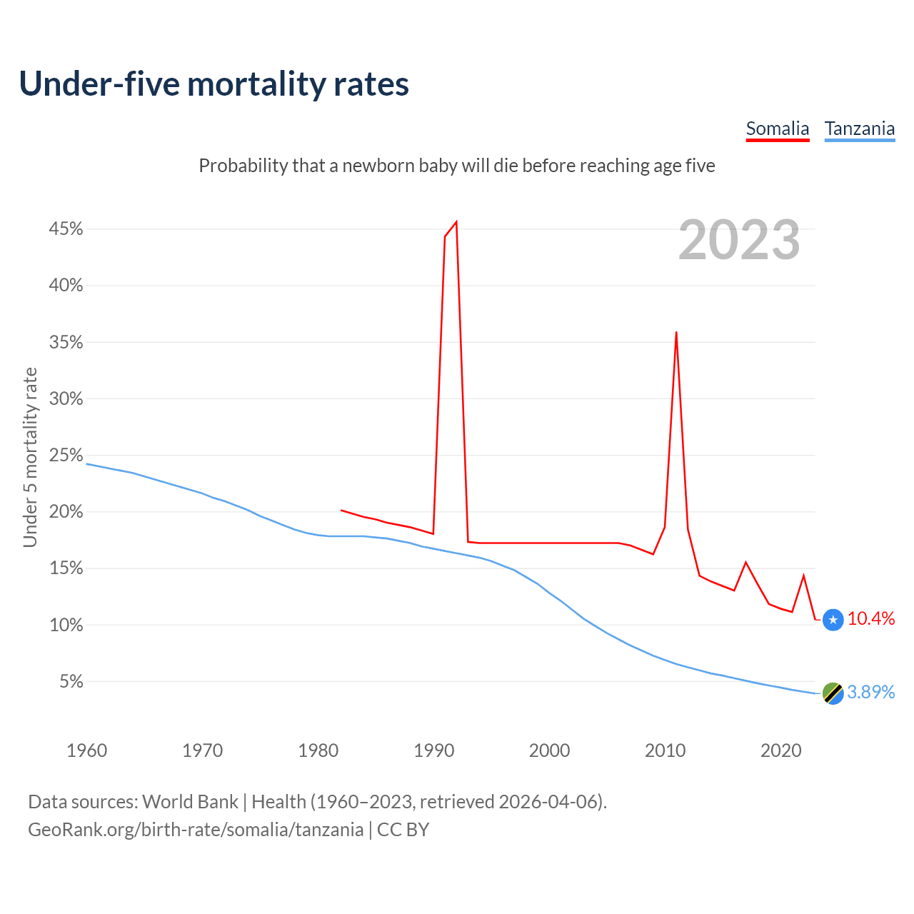 The chance that a newborn baby will die before reaching age five is 10.4% in Somalia and 3.89% in Tanzania. Above is a chart with historical data on under-five mortality rates.