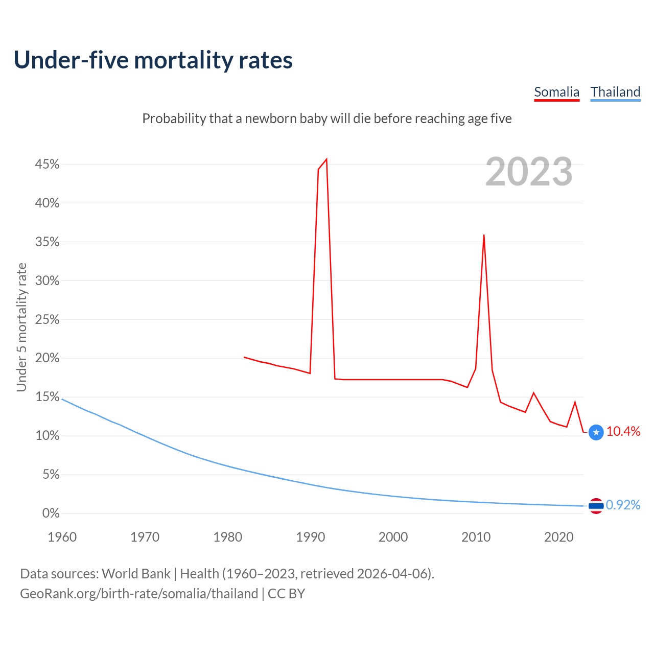 The chance that a newborn baby will die before reaching age five is 10.4% in Somalia and 0.92% in Thailand. Above is a chart with historical data on under-five mortality rates.