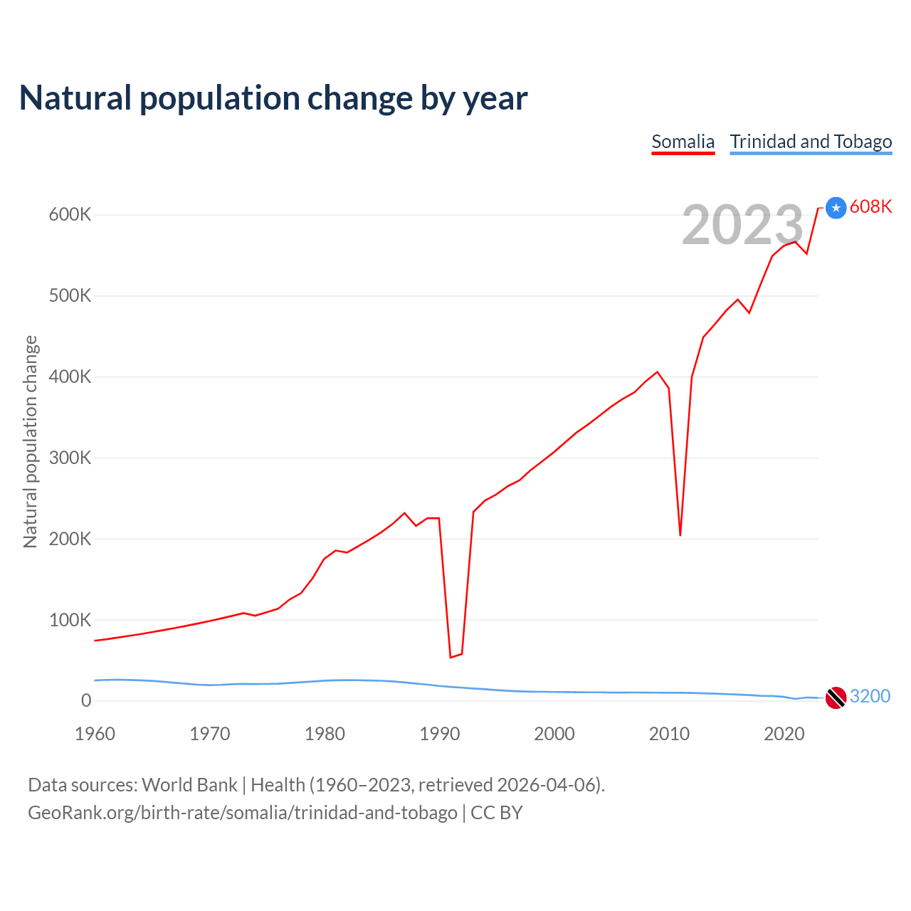 Somalia has an annual birth rate of 43 births per 1,000 people, compared to 10.7 for Trinidad and Tobago. The average number of children a woman is expected to have during her lifetime — the fertility rate, is 6.13 in Somalia and 1.53 in Trinidad and Tobago — 75% difference.
