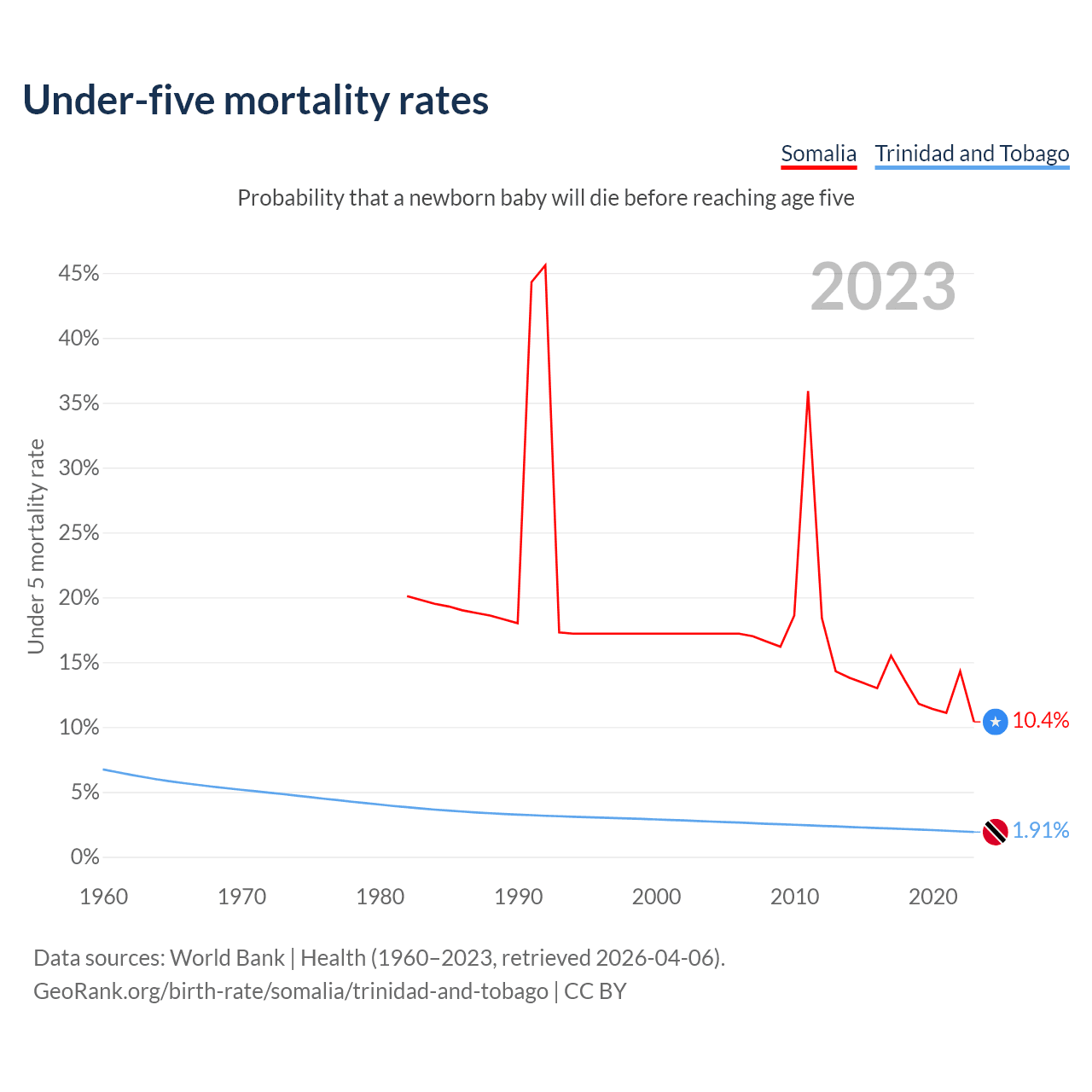 The chance that a newborn baby will die before reaching age five is 10.4% in Somalia and 1.91% in Trinidad and Tobago. Above is a chart with historical data on under-five mortality rates.