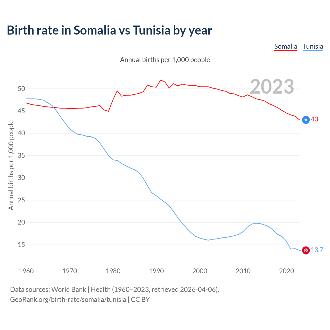 Somalia has an annual birth rate of 43 births per 1,000 people, compared to 13.7 for Tunisia. The average number of children a woman is expected to have during her lifetime — the fertility rate, is 6.13 in Somalia and 1.83 in Tunisia — 70.1% difference.