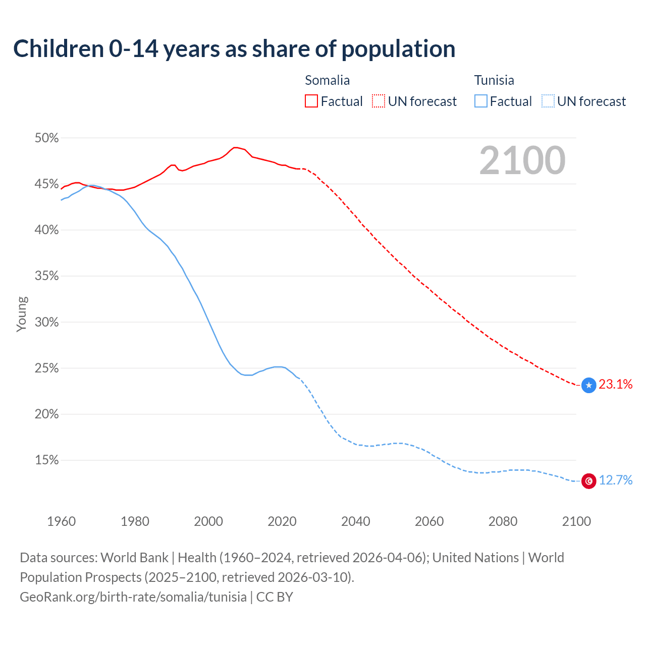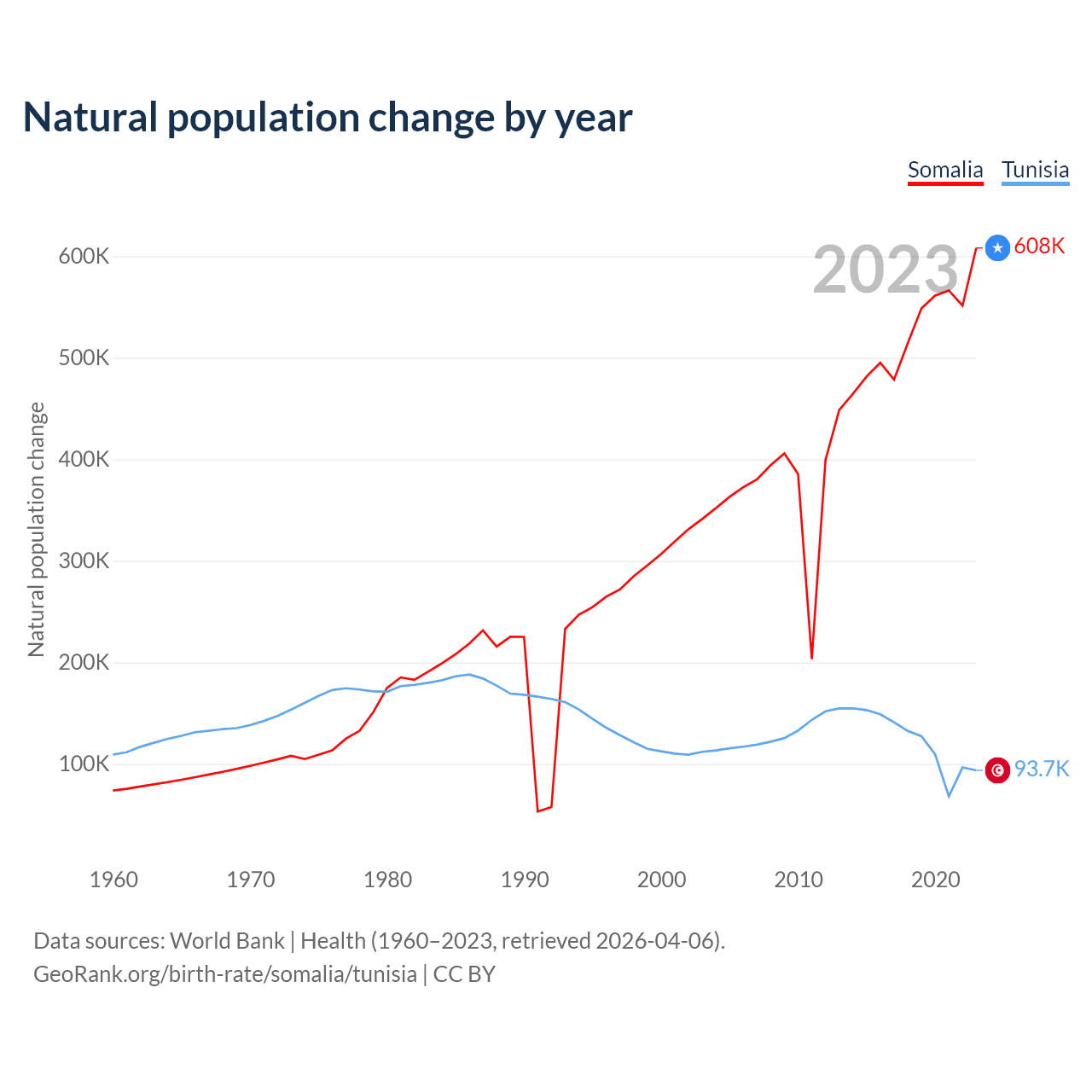 According to the latest available data on birth rates, the fertility rate in Somalia was 6.13 children per woman in 2023, compared to 1.83 in Tunisia in 2023. The replacement level is considered to be 2.1 children per woman.